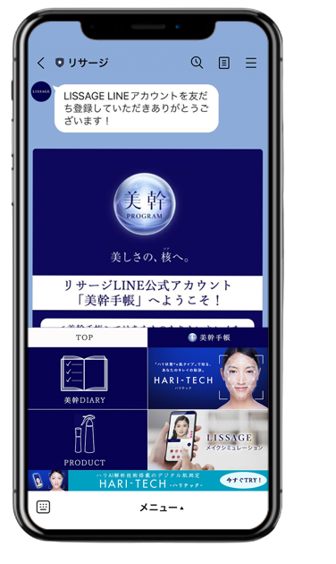 ページ内では商品紹介コンテンツやメイクシミュレーターのほか、一人ひとりの肌に寄り添い素肌美を応援するリサージの「美幹プログラム」の考えを元に、いつでもどこでも、もっとあなたの美しさを応援したいという想いでLINE公式アカウント内にて「美幹(ビカン)手帳」のサービスを展開。美幹手帳内のメニューとして、「HARI-TECH」*1ではスキンケア編の測定結果が保管できるようになり、「美幹DIARY」のダイアリー機能にて過去の測定結果のチェックや、日々の天気・コンディションの記録・確認をすることができ、ご自身の過去のコンディションを客観的に振り返ることができます。自身の肌を深く知ることでお手入れを見直すきっかけとなったり、スキンケアを続けるモチベーションアップに繋がったりと、一人ひとりの“なりたいキレイ“を継続的にサポートします。