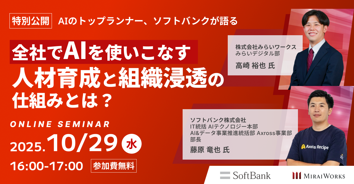 【10月29日(水)オンライン開催】AIのトップランナー、ソフトバンクが語る。全社でAIを使いこなす「人材育成」と「組織浸透」の仕組みとは?|特別無料セミナー