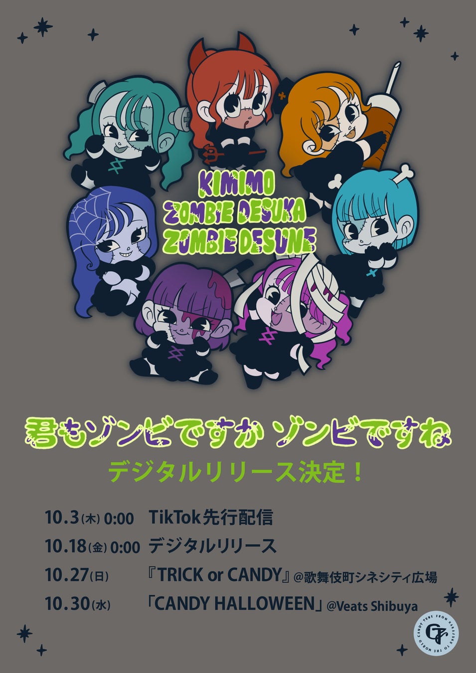 2024年8月に発売した1stシングルCD『キス・ミー・パティシエ』がオリコンデイリーランキング最高2位を獲得したCANDY TUNEが、本日10月18日(金)に新曲「君もゾンビですか ソンビですね」をリリース。Music Videoのティザー映像を公開したほか、10月27日(日)に開催するハロウィンライブの詳細を発表した。
