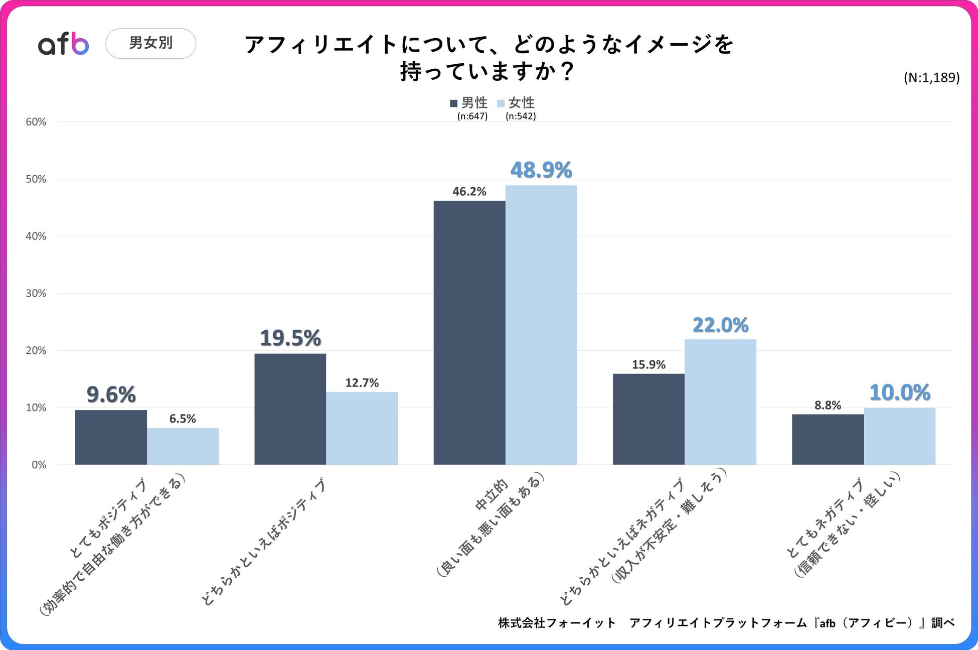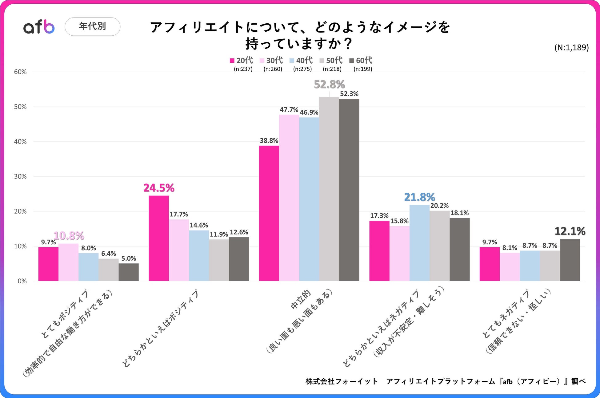 アフィリエイトプラットフォーム「afb(アフィビー)」< https://www.afi-b.com/ >の開発運用をおこなう株式会社フォーイットは、全国の20代~60代までの男女1,189人を対象にアフィリエイトに関するアンケートを実施し、年代別等の特徴についてまとめました。