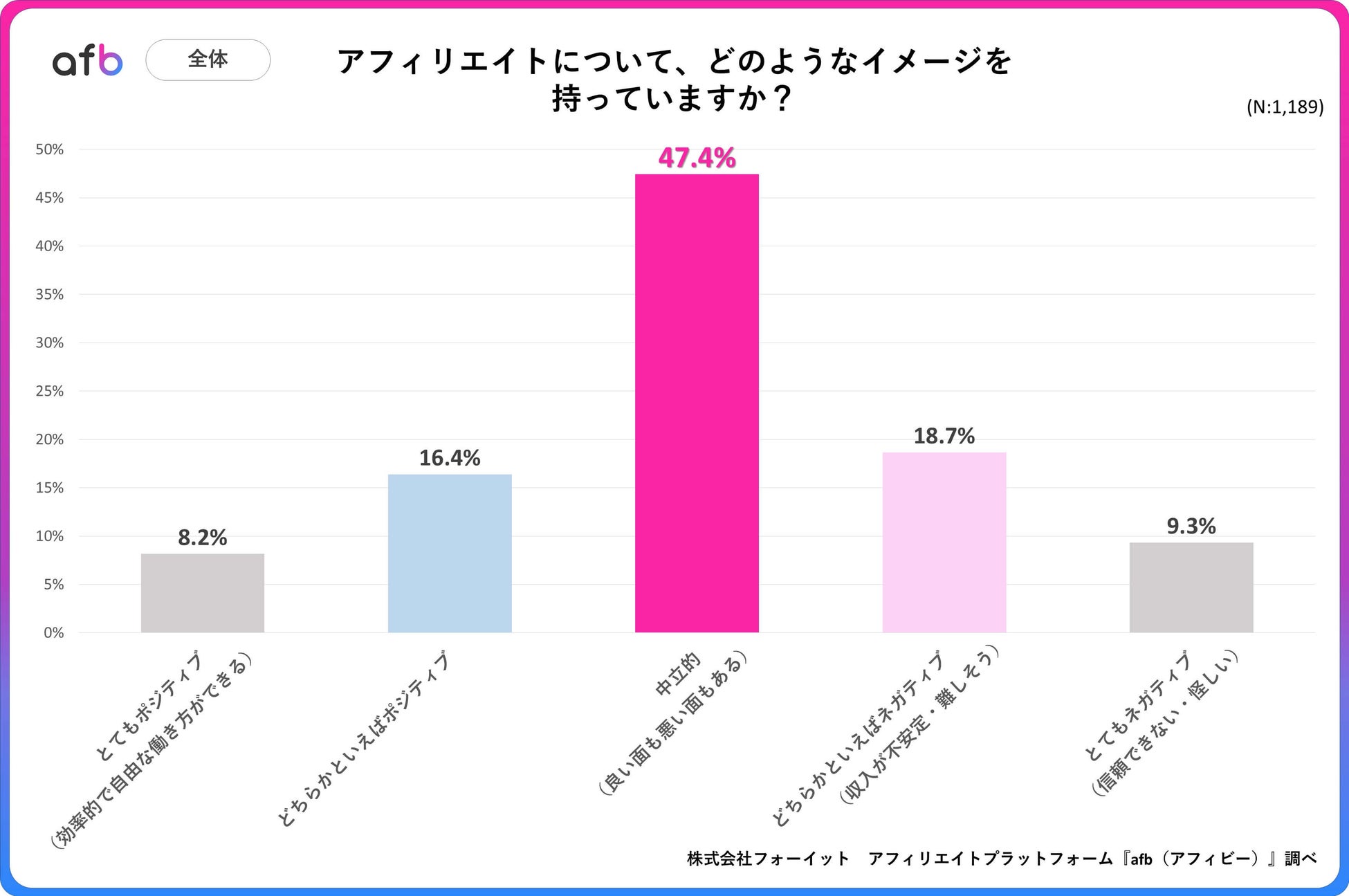 事前調査でアフィリエイトについて「知っている」と回答した20歳〜69歳の男女を対象に、「アフィリエイトについて、どのようなイメージを持っていますか?」というアンケートを実施したところ、最も多かった回答は「中立的(良い面も悪い面もある)」で47.4%でした。次いで、「どちらかといえばネガティブ(収入が不安定・難しそう)」が18.7%、「どちらかといえばポジティブ」が16.4%で続くという結果になりました。