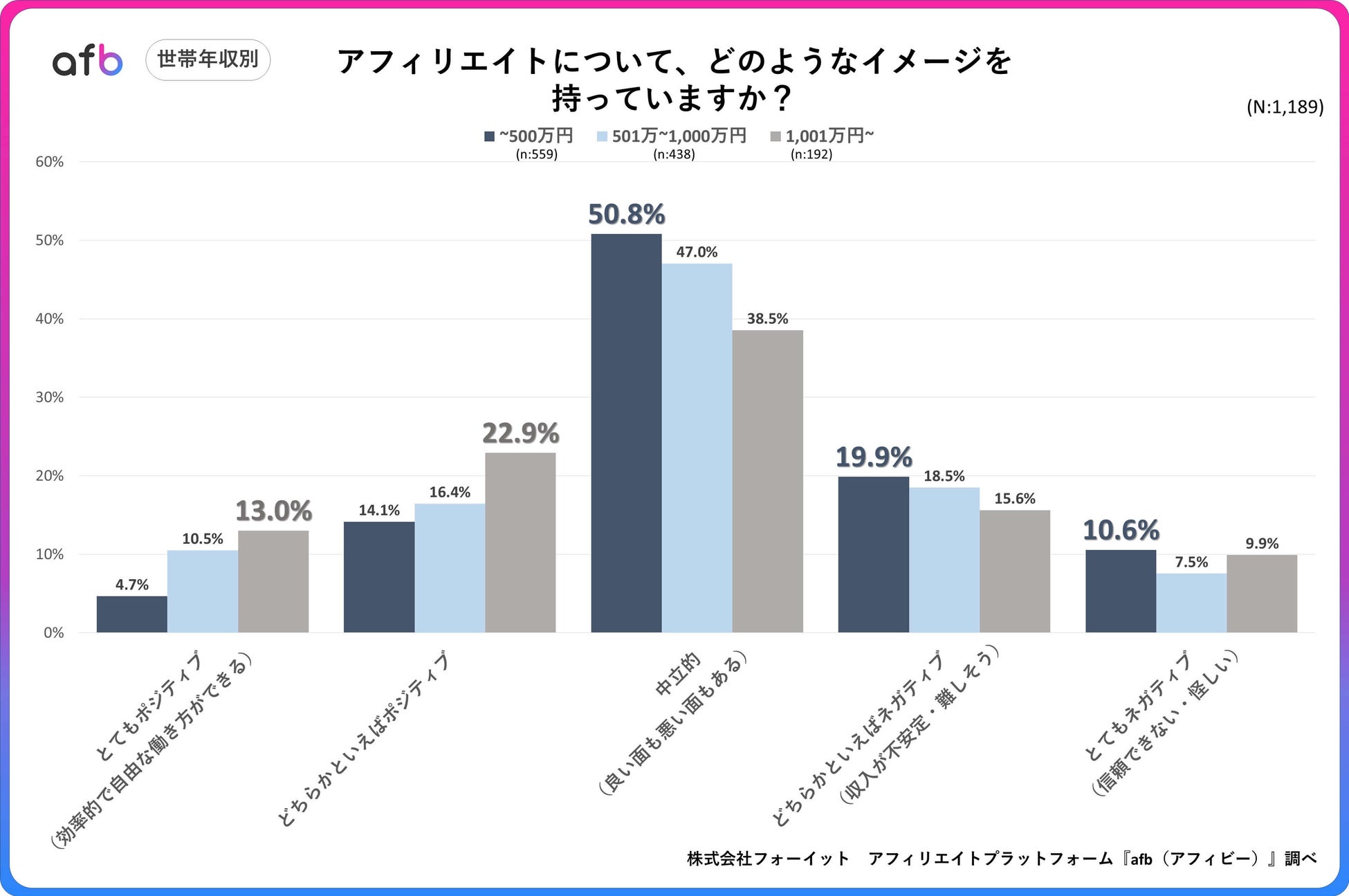 世帯年収別で見ると、世帯年収が1,001万円〜の層ではポジティブな回答をした方が最も多かったのに対して、〜500万円の層では中立的もしくはネガティブな回答をした方は最も多く、収入によってアフィリエイトに持つイメージに差があることが分かりました。また、過去に実施した「あなたは副業をしたことがありますか?」というアンケートでは、世帯年収が〜500万円以下の方と1,000万円以上の方では副業経験率に差があることが明らかになりました。高年収世帯では、実際にアフィリエイトで収入を得ている方の割合も多く、アフィリエイトに対してポジティブなイメージを持っている方が多い可能性が伺えました。