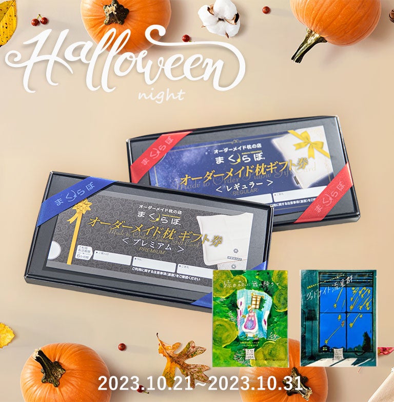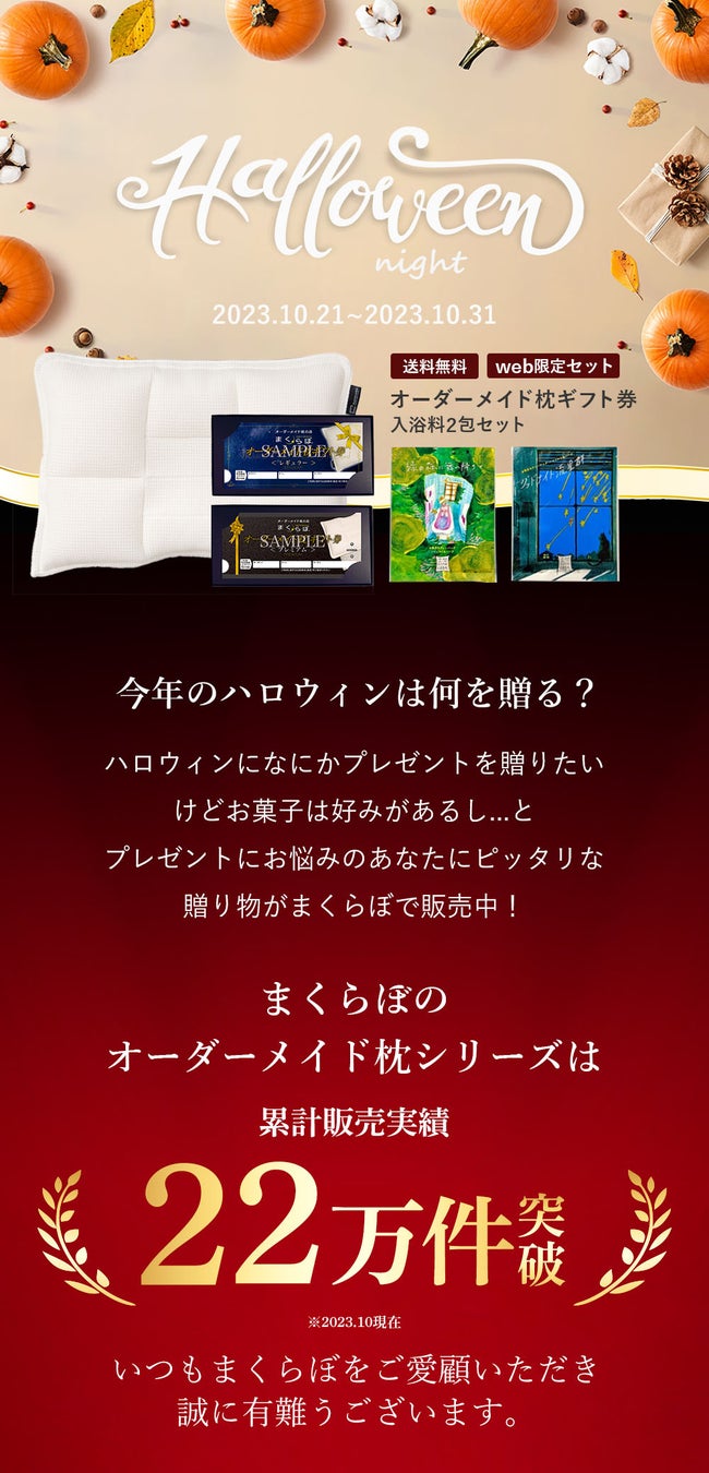 愛用者22万人を超えるまくらぼNo.1人気商品、「オーダーメイド枕」が作成できるギフト券に、お休み前のポカポカアイテムである入浴剤が付いてくるハロウィンだけのギフトをご自身の日頃の頑張りへのご褒美や大切な方へのプレゼントとして贈りませんか?
