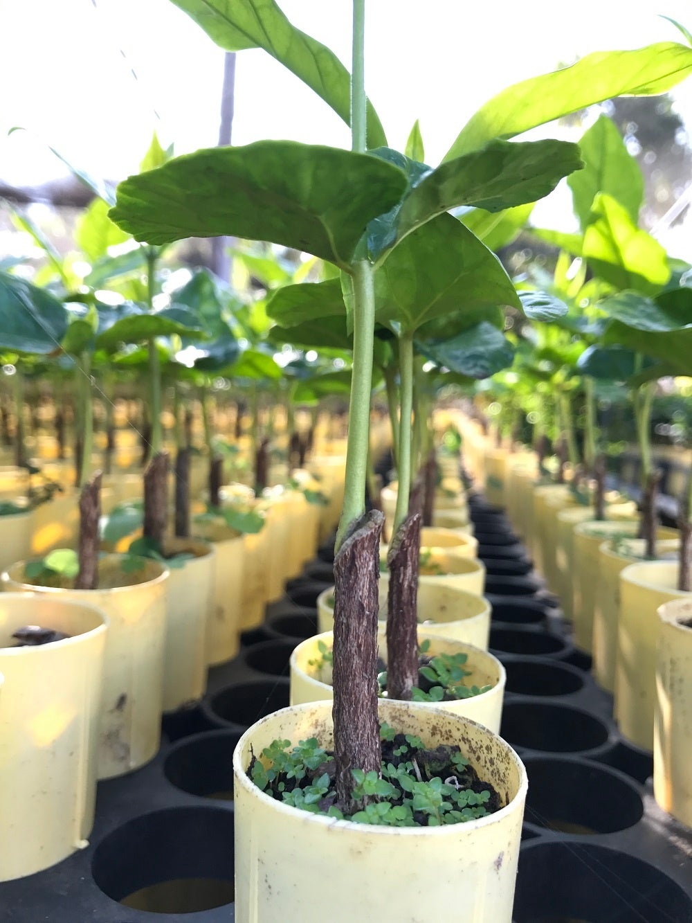 リベリカ種の根っこに、ティピカ種を接ぎ木して苗作りから行い、高品質でありながら、丈夫なコーヒーの樹になるよう育んでいます。