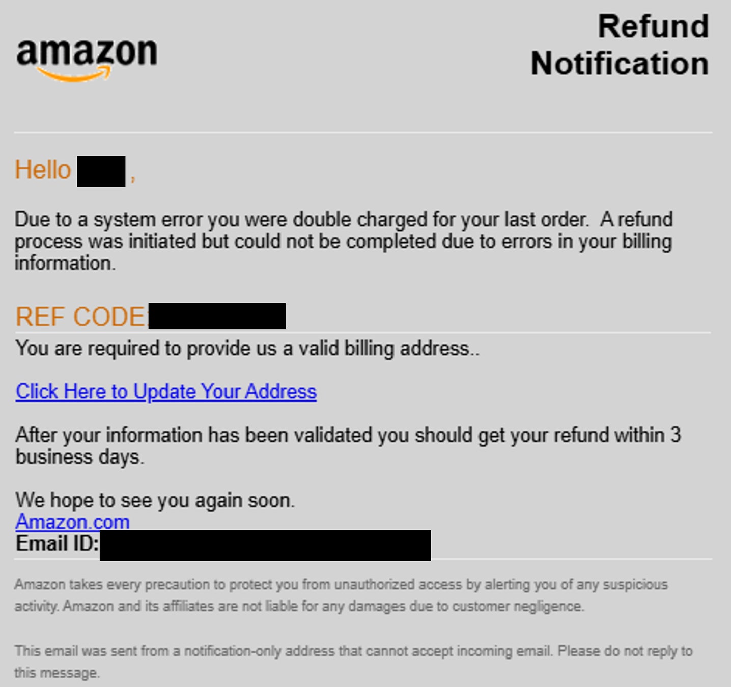 CPRは先日、Amazonになりすましたフィッシング攻撃を傍受しました。「返金予定-Amazonシステムエラー」(Refund Due - Amazon System Error)という件名のメールは、Amazonからの発信を装うメールアドレスから送信され、「アドレス更新」というリンクをクリックするよう受信者を誘導していました。リンクは、ユーザーの認証情報を収集するために作成された偽のAmazonログインページにつながっていました。
