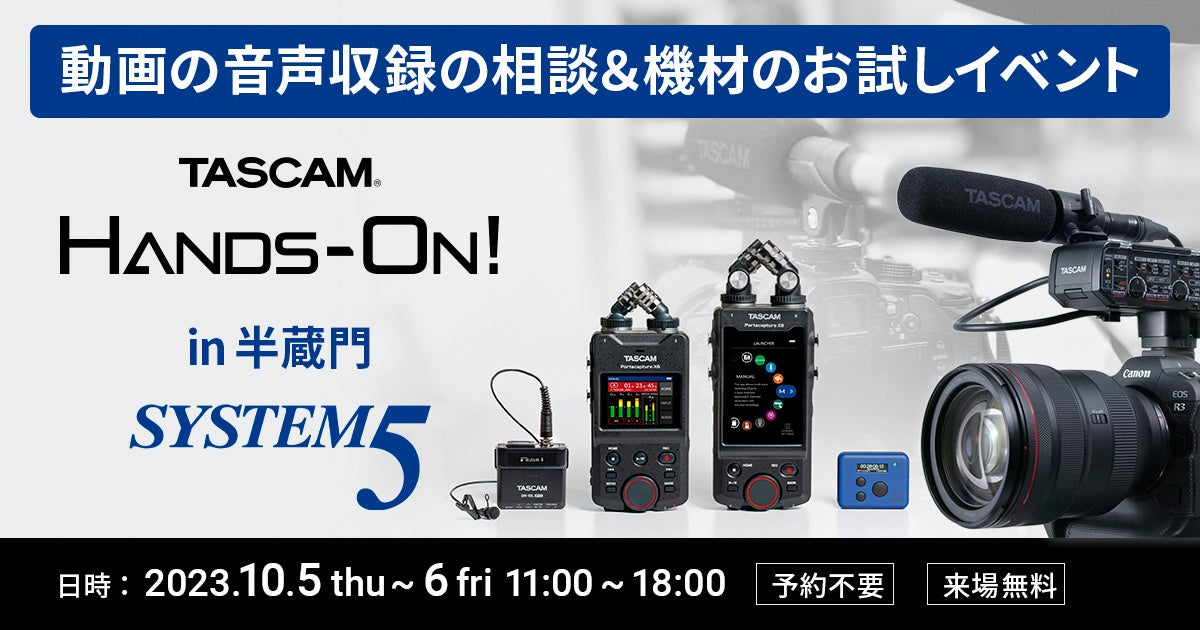 ティアック株式会社 (本社:東京都多摩市、代表取締役社長:英 裕治) は、2023年10月5日 (木) ~10月6日 (金) に東京都千代田区にあるプロ用映像機器や撮影機器などの専門店、株式会社システムファイブの直営店舗PROGEAR半蔵門にて、TASCAMの動画用音声レコーダーやカメラ用XLRマイクアダプターなどの展示試聴イベント、「【出張】TASCAM Hands-On! 動画音声機材イベントinシステムファイブ」を開催いたします。