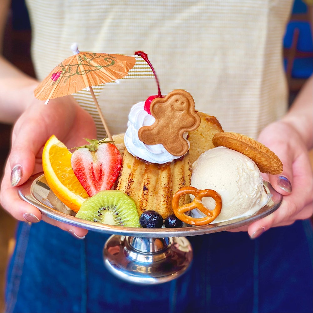 「カヌレプリン」は、カヌレのようなかわいらしい見た目と、もちもち食感が新しい新感覚の自家製プリンです。カヌレプリンを彩るようにフルーツやアイスクリームが盛りつけされた「カヌレプリンアラモード」は、SNS映えするかわいらしいスイーツに仕上げました。