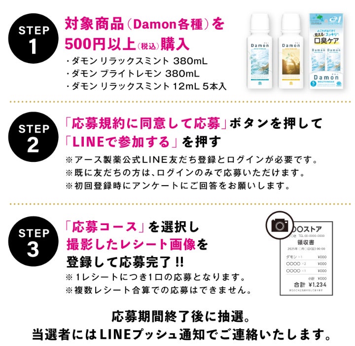 ■キャンペーン概要:ダモンシリーズを税込500円以上お買い上げのレシート1枚をキャンペーンサイトから読み取って応募。2つのコースのどちらかを選んで応募。(Aコースの場合は、6種からお好きな1種を選んでいただきます。)
