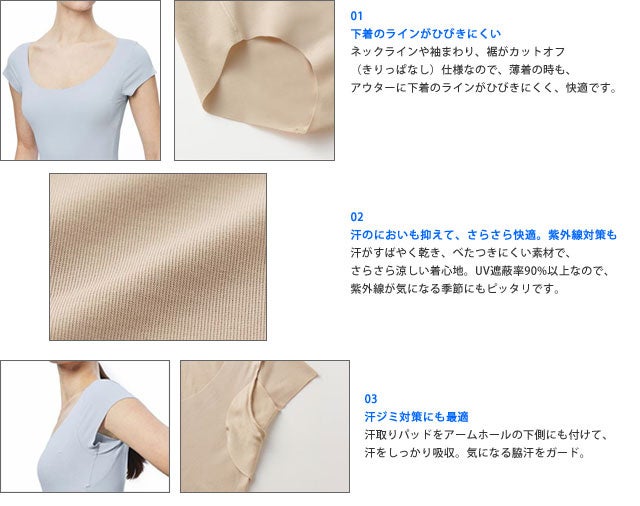 本商品は、吸汗速乾素材を採用し、汗をかいてもすばやく乾いてべたつきにくいさらさら涼しい着心地のインナーです。ネックラインや袖まわり、裾がきりっぱなしのカットオフ仕様なので、アウターに下着のラインがひびきにくく、薄着の季節も安心です。さらに、UV遮蔽率90%以上で、紫外線が気になる季節にうれしいポイントも。トップスはキャミソール、ラン型インナー、フレンチ袖インナー、ラン型スリップをラインアップ。全てに、汗取りパットを付けて気になる 脇汗もガード。ボトムは、レギュラーショーツの他に、汗ジミや冷房対策にも活躍する2分丈ショーツ、5分丈ショーツも 揃えました。