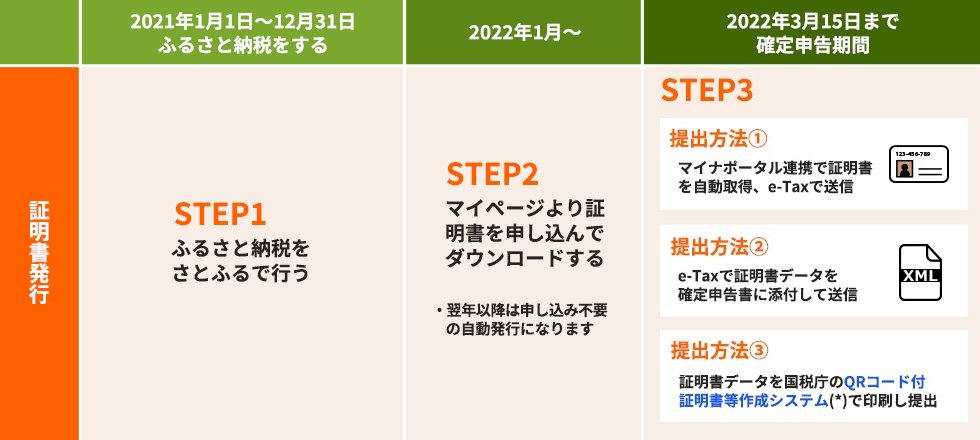 2021年の寄付分から、国税庁の指定する特定事業者(ふるさと納税サイト)(※1)が発行する年間寄付額を記載した「寄付金控除に関する証明書」を利用し、確定申告で寄付金控除の適用を受けられるようになりました。「さとふる」が発行する「寄付金控除に関する証明書」が1枚(※2)あれば、これまで寄付件数分の「寄付金受領証明書」を添付する必要があった確定申告手続きが簡便になるほか、申告時期までの書類保管が不要となります。
