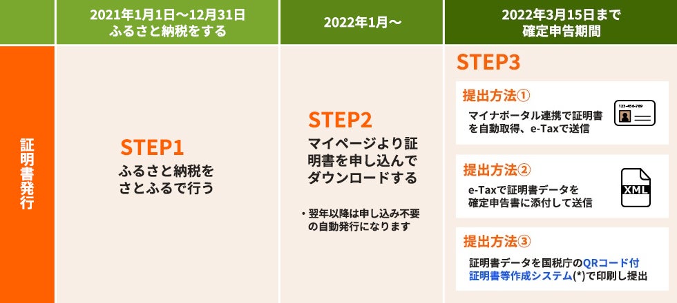 「さとふる」では、2021年分の「寄付金控除に関する証明書」発行・発送サービスを現在受け付け中です。「さとふる」は、国税庁の指定する特定事業者で唯一(※3)電子発行に加え、郵送による書面発行にも対応しているため、e-Taxやマイナポータル連携で確定申告を行う方はもちろん、税務署や郵送で確定申告を行う方の確定申告手続きが簡素化されます。