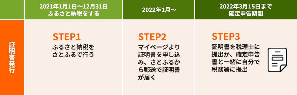事前に書面発行を申し込むことで、確定申告時期に「さとふる」から「寄付金控除に関する証明書」が郵送され、寄付者が印刷する手間がかかりません。なお、新型コロナウイルス感染などにより2022年3月15日(火)の期限までに申告が困難な方は4月15日(金)まで延長できることから、書面発行は3月23日(水)まで申し込みを受け付けます。