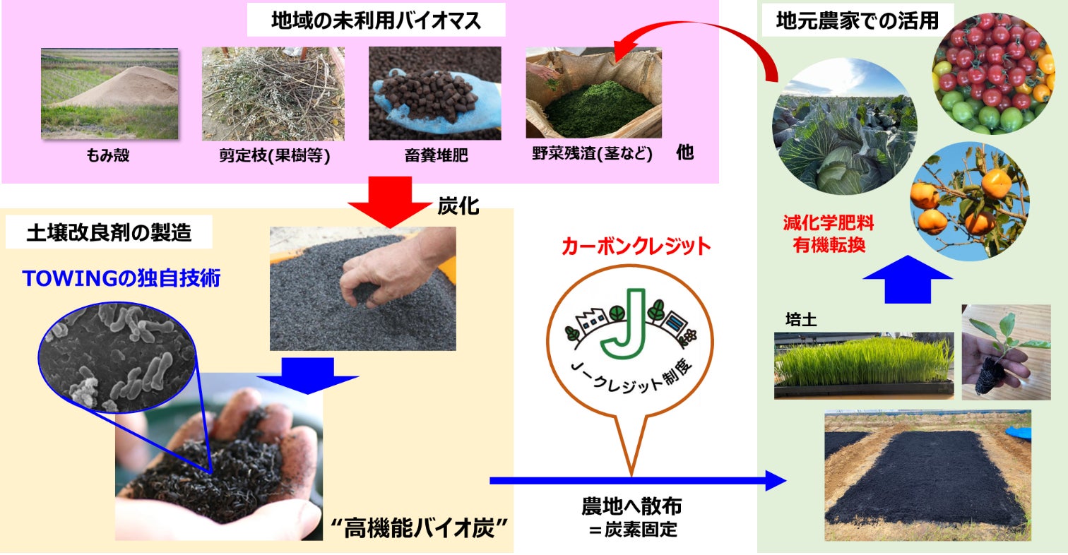 ※2:TOWING独自のバイオ炭の前処理技術、微生物培養等に係る技術を、国立研究開発法人農業・食品産業技術総合研究機構が開発した技術と融合し、実用化しました。