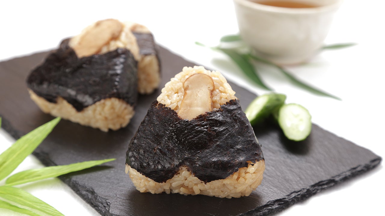 松茸風味の茶飯に松茸スライスをトッピングしました。香り豊かな松茸の味わいが秋らしく、おにぎりにすることで秋ならではの味を手軽に楽しめます。