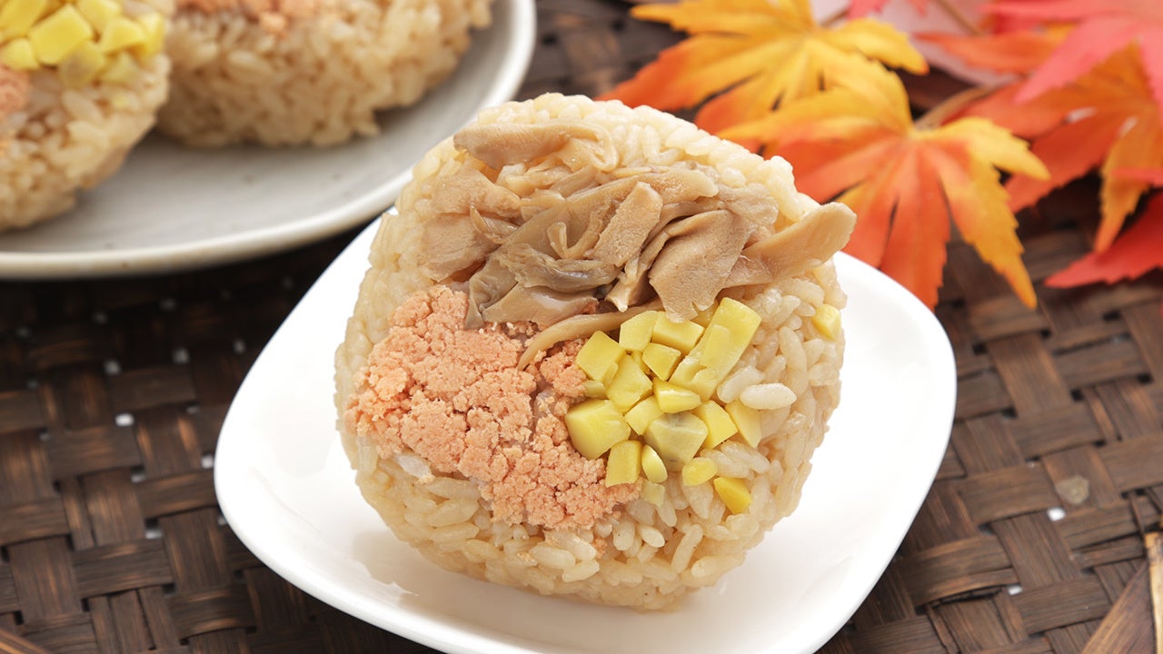 茶飯をベースに、豪華な3種の異なる具材をトッピングした秋らしい彩りのおにぎりです。具材は、舞茸煮、栗甘露煮、焼鮭ほぐしを使い、秋の味覚がたっぷり楽しめる仕様です。