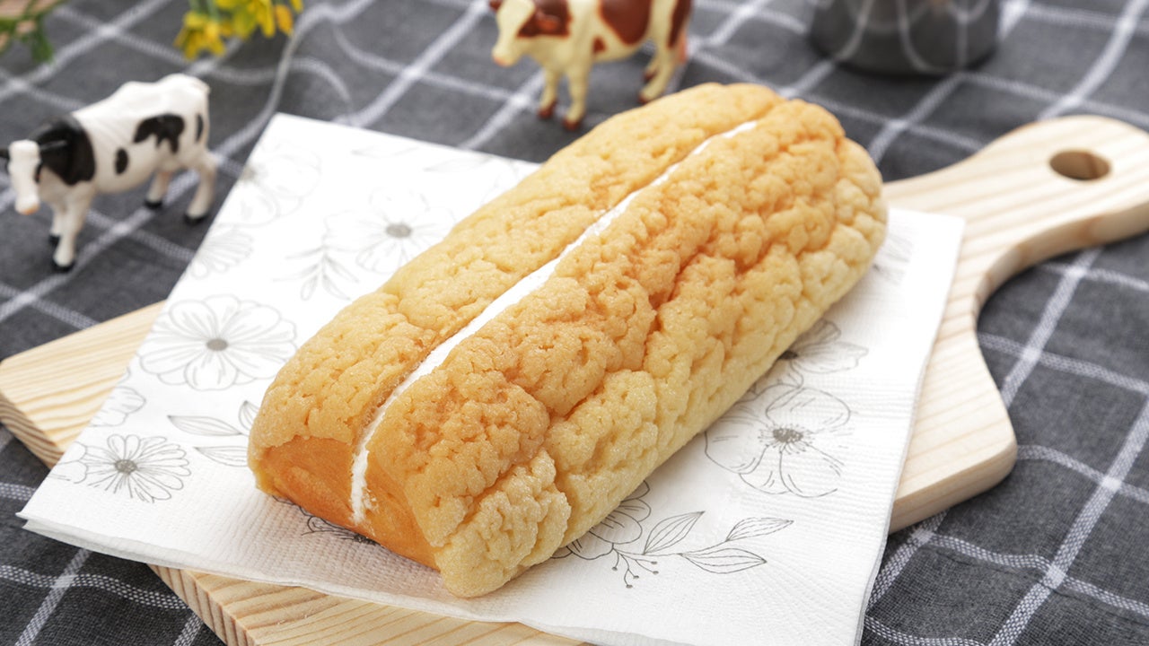 ミルク味のクリームを折り込んだパンに、ビスケット生地をのせて焼き、ミルクホイップをサンドしたミルク感豊かなパンです。最後まで、サンドされたミルクホイップとビスケット生地の食感が楽しめます。