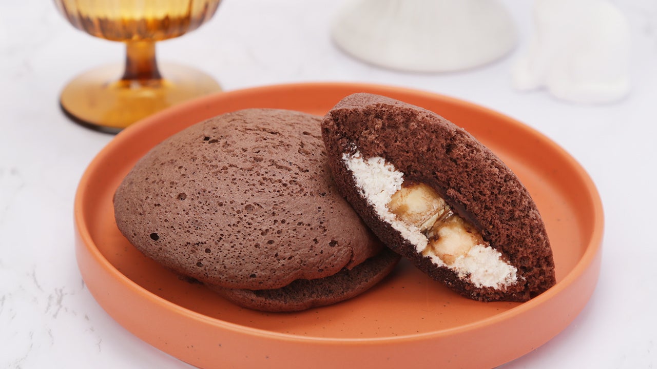 パリッとした食感のチョコレートとスライスしたバナナ、ホイップクリームをチョコのスフレケーキでサンドしました。全体的にふんわりとした食感の中に、パリパリのチョコがアクセントになっています。