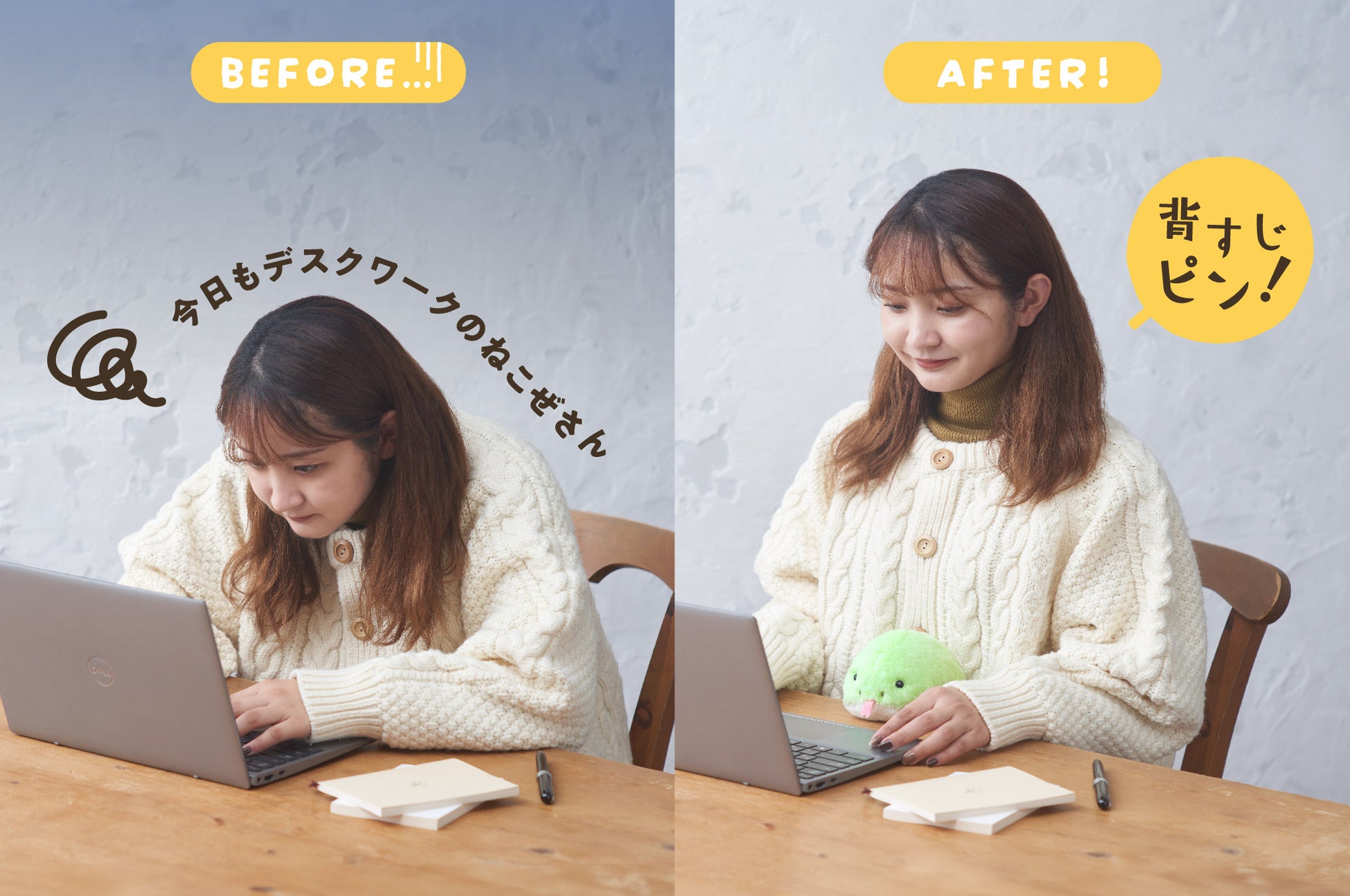 「ふんばるず」を落とさないよう、机とおなかの間にしっかり挟み込むため、自然と背筋が伸び、良い姿勢に。つい“猫背”になってしまうあなたも、シャキッとした背筋に早変わり。2025年も仕事や勉強を頑張る猫背なあなたをサポートしてくれます。