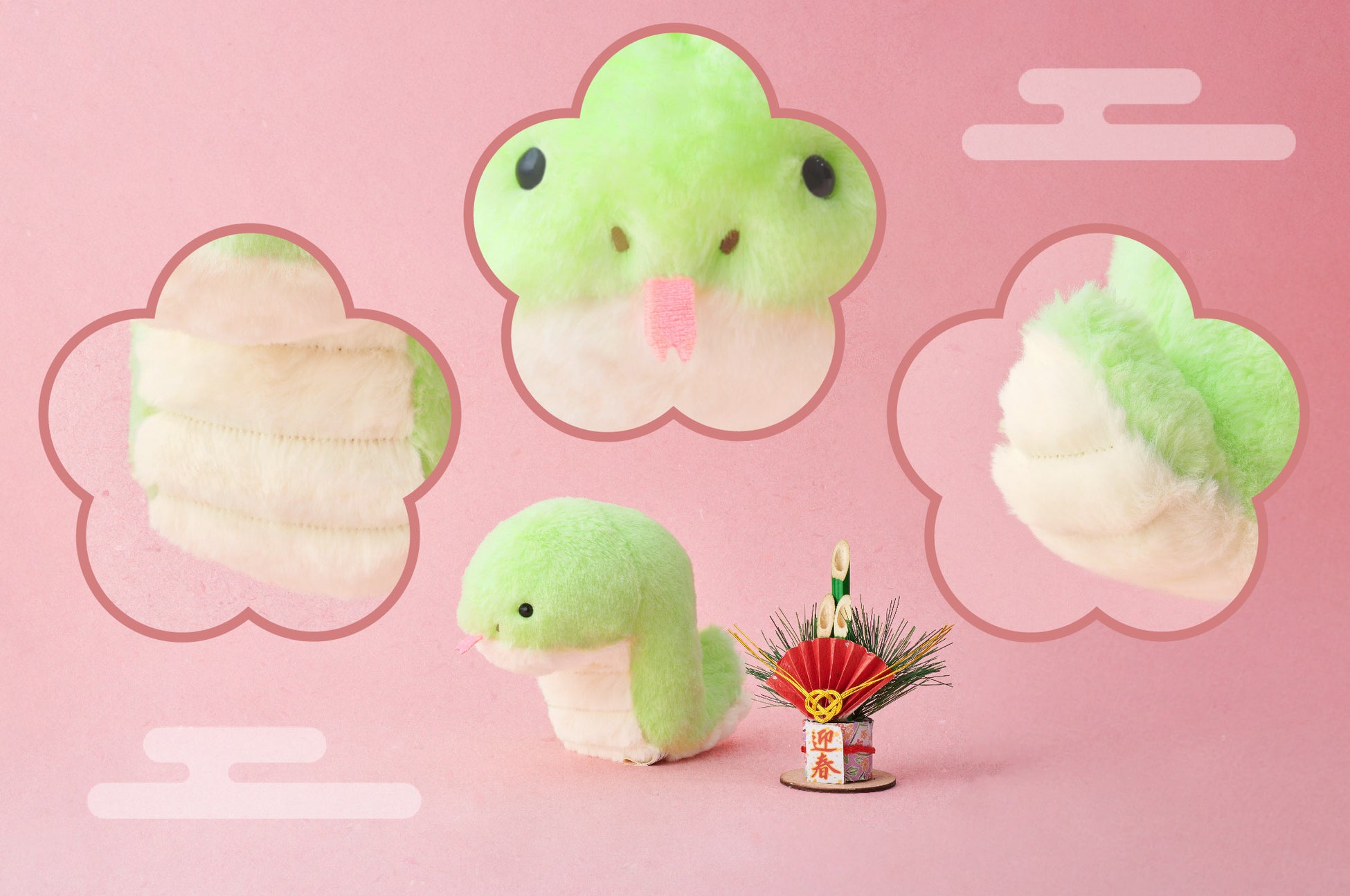 ちょこっと飛び出した舌やじゃばら模様のおなか、にょろっと伸びた尻尾など、ヘビの特徴をかわいらしく表現したデザインは、干支の商品としてはもちろん、ヘビ好きにもたまらないデザインとなっています。