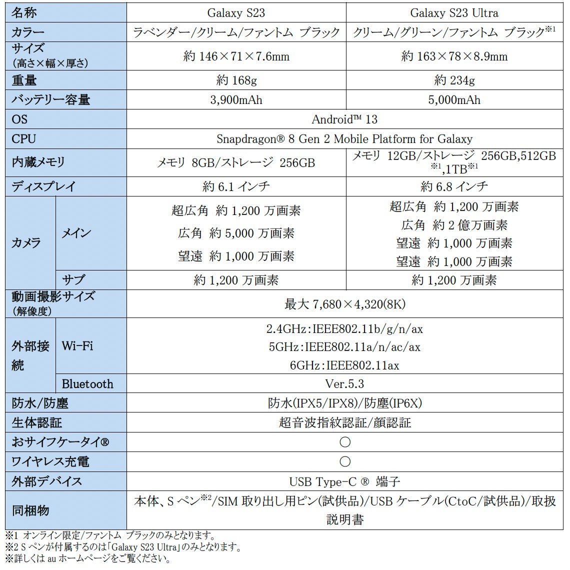 <主な仕様:「Galaxy S23」、「Galaxy S23 Ultra」>