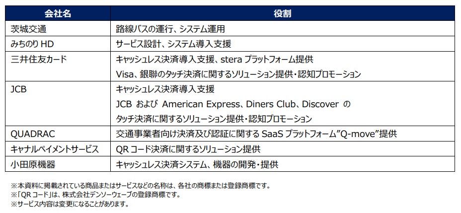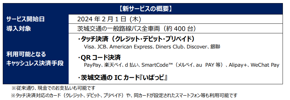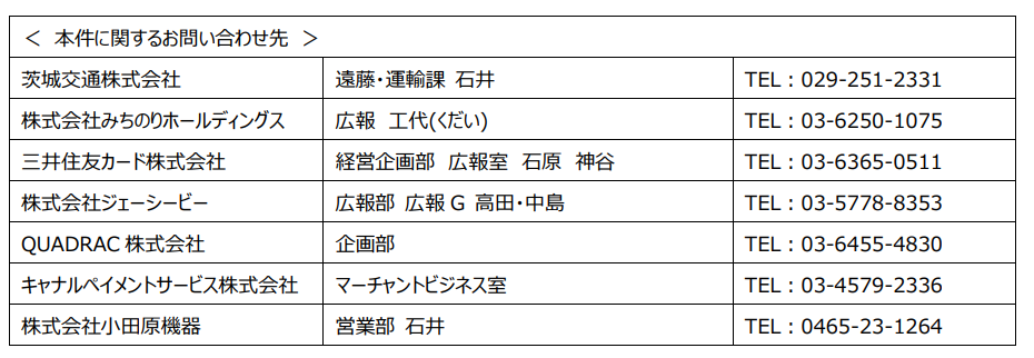 この度、茨城交通株式会社(代表取締役社長:任田正史、以下:茨城交通)、株式会社みちのりホールディングス(代表取締役グループCEO:松本 順、以下:みちのりHD)、三井住友カード株式会社(代表取締役社長:大西 幸彦、以下:三井住友カード)、株式会社ジェーシービー (代表取締役兼執行役員社長:二重 孝好、以下:JCB)、QUADRAC 株式会社(代表取締役社長:高田 昌幸、以下:QUADRAC)、キャナルペイメントサービス株式会社(代表取締役社長:伊藤 達矢、以下キャナルペイメントサービス)株式会社小田原機器(代表取締役:丸山 明義、以下:小田原機器)は茨城交通の運行する路線バス全車両(約400台)で、2024年2月1日(木)からクレジットカード等※のタッチ決済、QRコード決済のサービスを開始します。