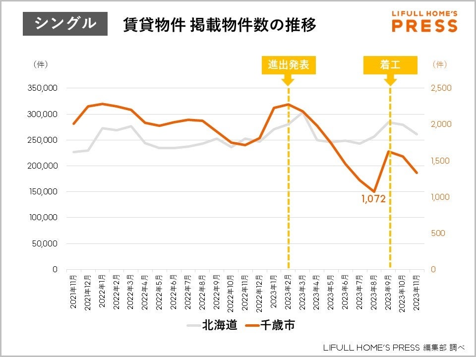 LIFULL HOME'Sに掲載された賃貸物件の数は、ラピダスが千歳市への進出を発表した翌月(2023年3月)以降、特にシングル向け物件が急激に減少し、2023年8月の1,072件が底となっています。