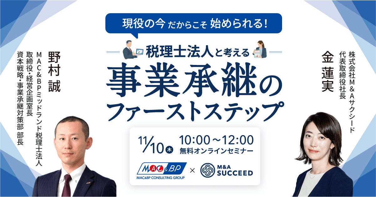 法人 ・審査制M&Aマッチングサイト「M&Aサクシード」を運営するVisionalグループの株式会社M&Aサクシード(所在地:東京都渋谷区/代表取締役社長:金 蓮実)と、MAC&BPミッドランド税理士法人(所在地:愛知県名古屋市/理事長:齋藤 孝一)は、2022年11月10日(木)10時より、オンラインセミナー「現役の今だからこそ始められる!税理士法人と考える事業承継のファーストステップ」(無料)を開催します。(詳細URL:https://ma-succeed.jp/content/event/seminor-taxaccountant-01)