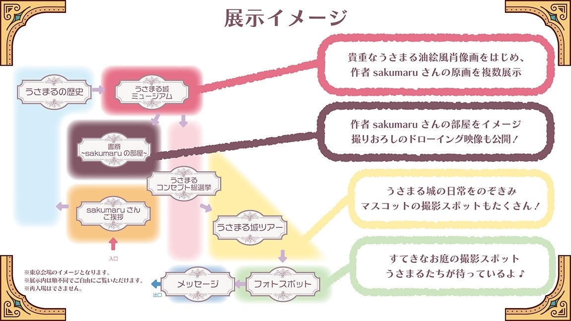 作者sakumaruさんのメッセージからはじまり、うさまるの歴代ぬいぐるみや原画の展示、フォトスポットなどで構成されている展示会場は、うさまるの10周年を記念した盛りだくさんの内容となっています。この機会に是非ご来"城"ください!
