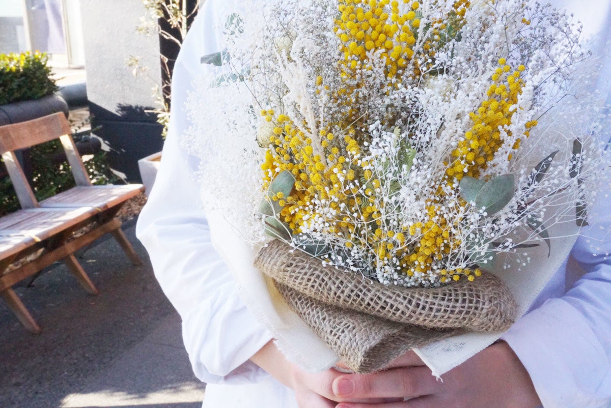 この企画は、3月8日(火)〜3月31日(木)の期間中、おふろcafe utatene売店にて「ミモザ」のスワッグや植物標本などを販売し、売り上げの一部をHAPPY WOMAN基金に寄付するというものです。3月8日の「国際女性デー」は、国連によって制定された、女性の社会への参画を願う日です。同時にイタリアでは「ミモザの日」と呼ばれており、女性に感謝を込め、愛や幸福の象徴であるミモザが贈られています。