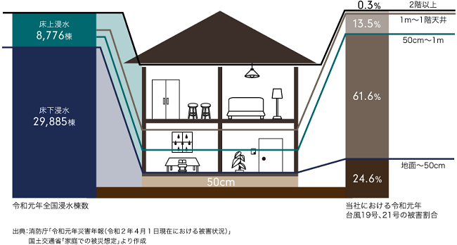 近年、大型の自然災害が頻発している中、特に梅雨前線や台風などの「水害」により甚大な被害がもたらされています。「令和元年台風19号」が発生した2019年における全国の浸水棟数は、床上浸水が8,776棟、床下浸水が29,885棟と報告されています。また、当社においては、令和元年台風19号、20号において浸水被害を受けた当社管理建物のうち、地面から50cm~1mまでの床上浸水の被害が61.6%と最も多いことから、今後、新たに供給する賃貸建物における水害対策が大きな課題となっています。