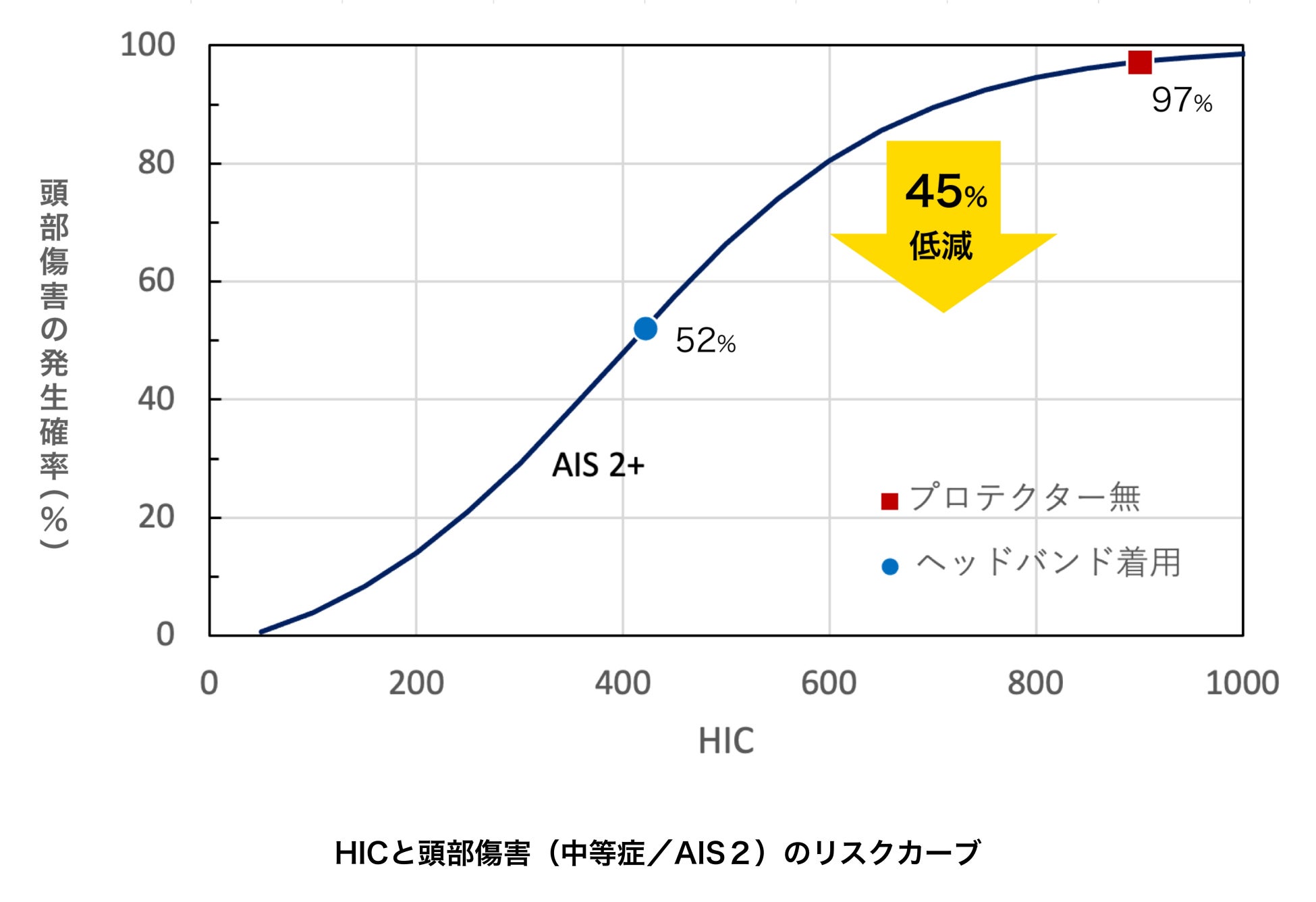 転倒や衝突時の頭部障害(中等症)の発生リスクを45%、頭部への衝撃は43%低減