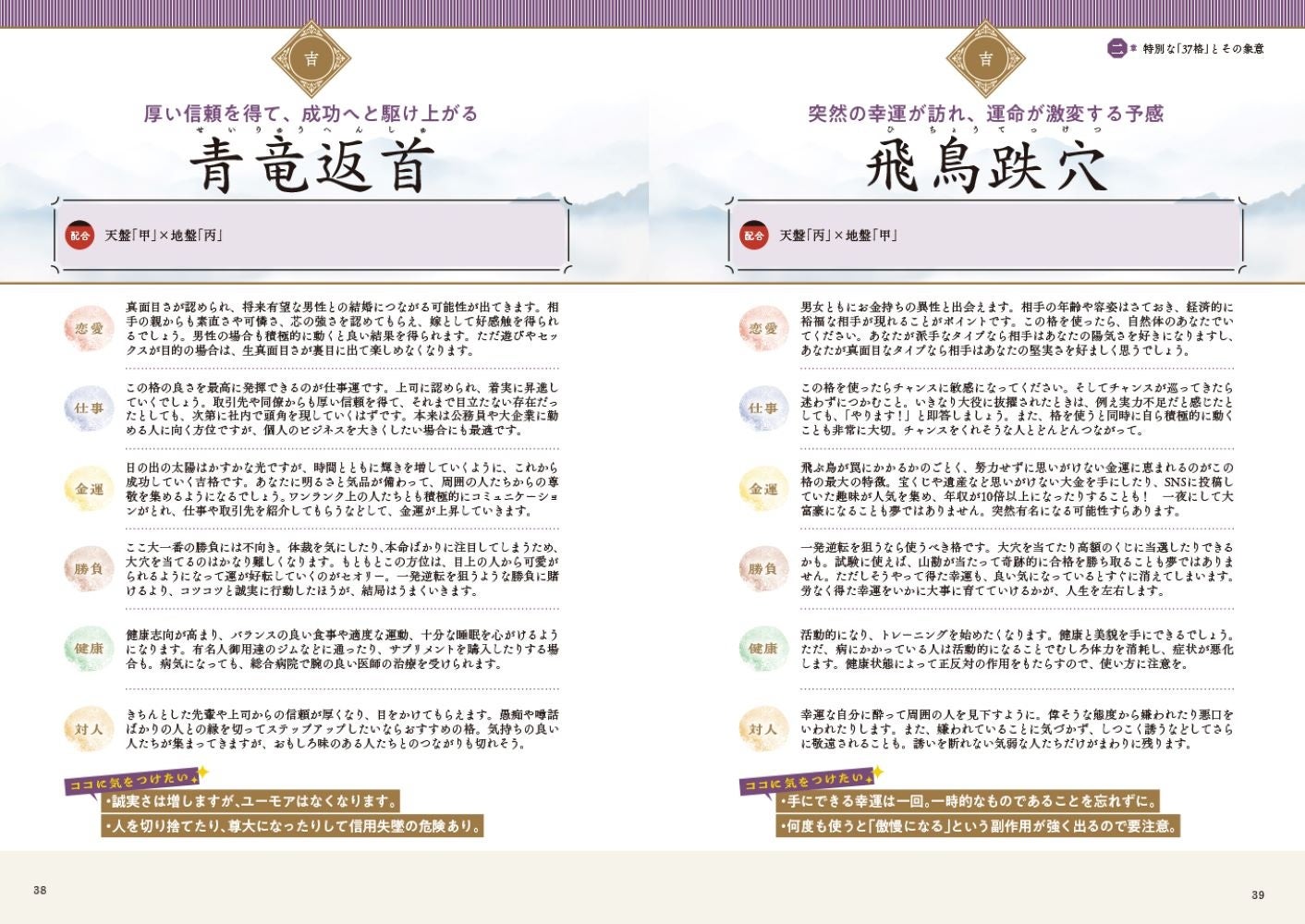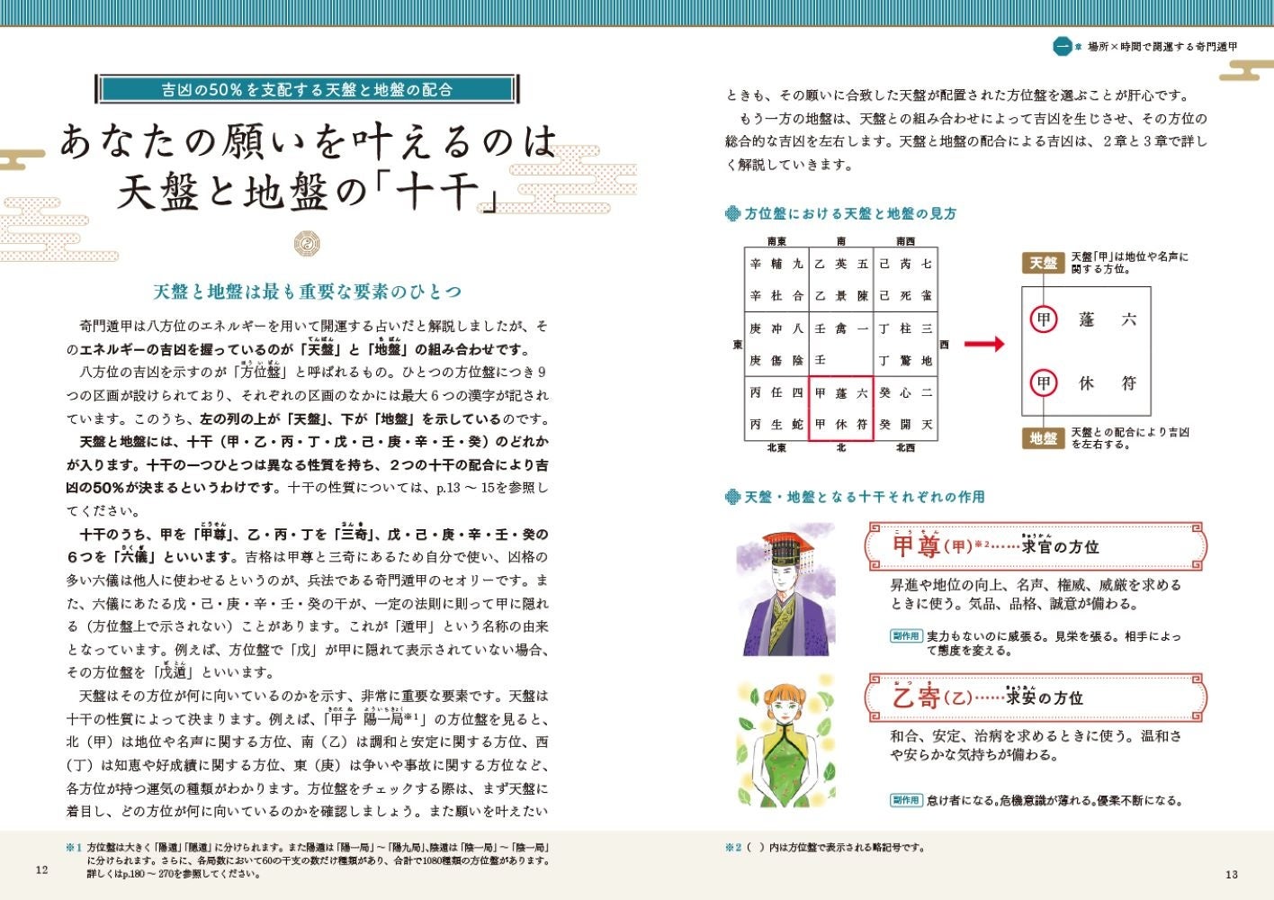 奇門遁甲はもともと兵法であり、歴史的に戦のノウハウに使われたやや難解な占術でもありますが、本作では、勝利を望む男性のみならず、現代の社会を生きる女性にも、そして初心者にも、イラストや図版などを盛り込みフルカラーで非常にわかりやすいかたちに落とし込みました。