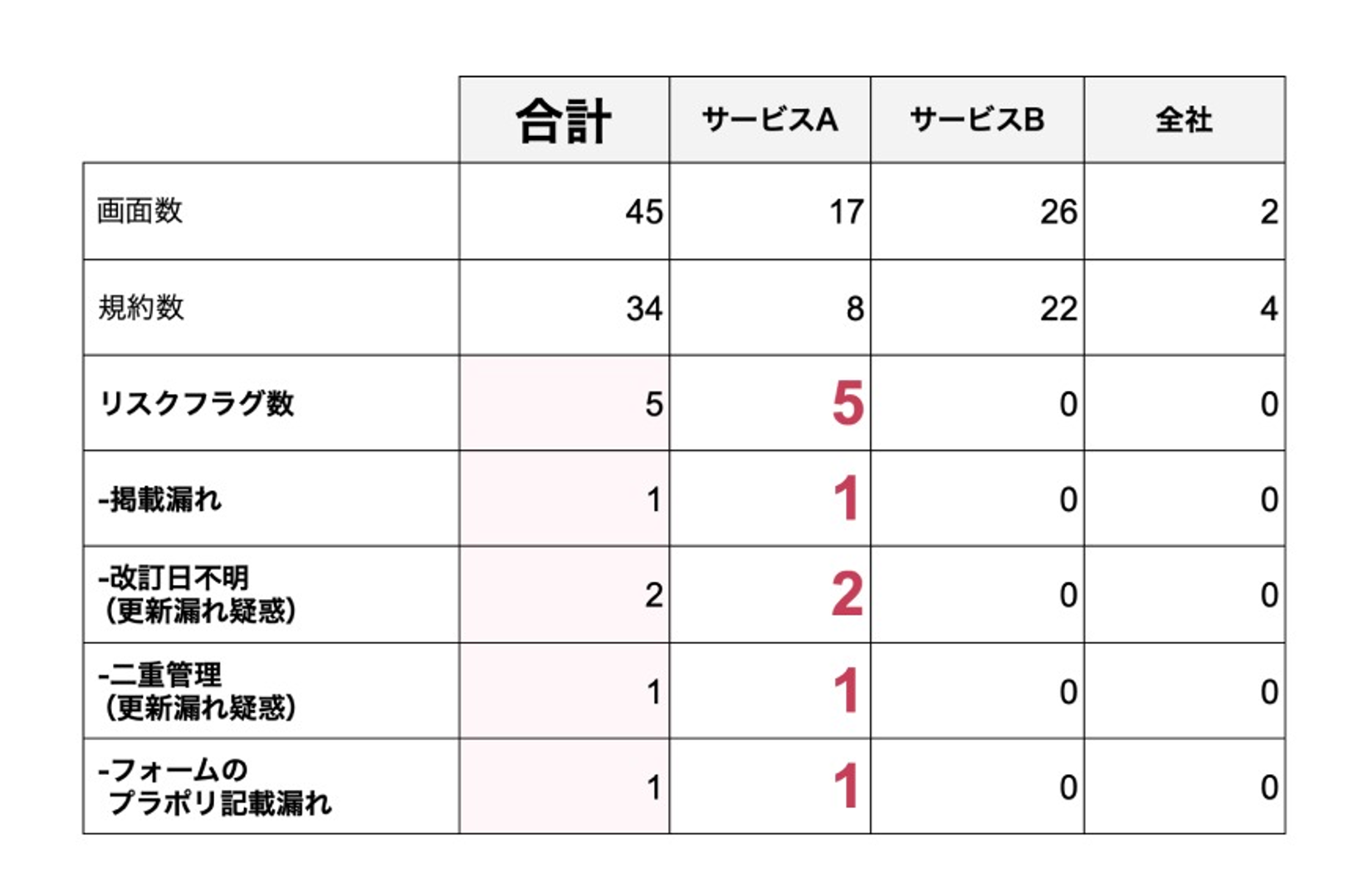 termhubフリープランは、自社のWEBサービスやアプリの利用規約やプライバシーポリシーに関するリスクを可視化・発見するサービスです。公開されている規約とその表示画面の洗い出し作業をtermhubチームが行い、その結果をもとに利用規約に関するリスクフラグレポートを提供します。このレポートは、規約の自体のチェックではなく、リンク切れやコピペミスなどのWEBサービス・HP・アプリ運営をする上でのリスクがまとめられています。また、規約の数や規約を掲載している画面なども可視化することも可能です。さらに、フリープランではtermhubの有料プランのデモ環境を利用でき、規約の修正からWEB画面への反映までの作業を法務だけで完結できる機能を試すことができます。※「リスクフラグ」レポートはtermhub独自基準に基づいて算出しております。