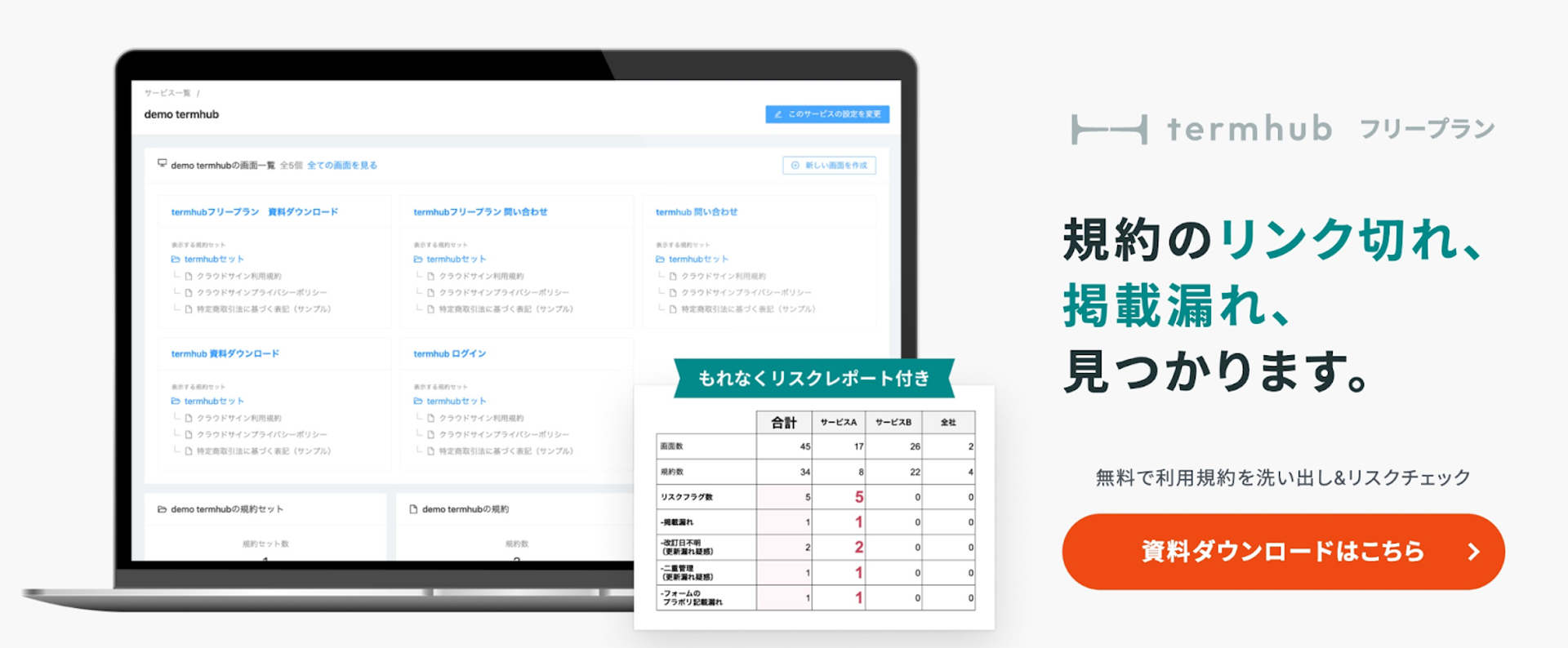 今回の調査に利用したtermhubでは、企業が運営するWEBサービス・HP・アプリなどに掲載している利用規約の洗い出し&利用規約リスクチェックとサービスのデモ環境が体験できる「termhubフリープラン」の提供も開始しております。