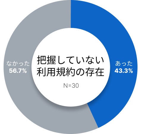 「法務部が作成経緯や運用実態等を把握していない利用規約を見つけたことはありますか」と尋ねたところ、「あった」が43.3%、「なかった」が56.7%と回答。この結果から法務部が把握できていない利用規約が存在していることが明らかになりました。