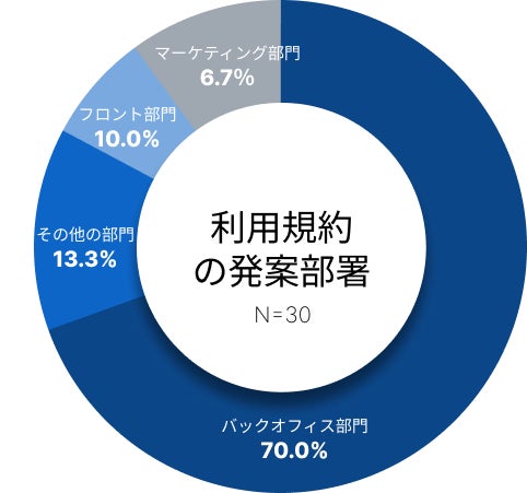 「自社サービスの利用規約の草案はどの部署が作成しますか」と尋ねたところ、「バックオフィス部門(法務、管理、総務など)」が70%と多く、「その他の部門」が13.3%、「フロント部門(営業・事業など)」が10%、「マーケティング部門(宣伝・販促・広報など)」が6.8%となっています。この結果から、利用規約の多くは法務部が作成するが、一部は他部署も作成していることがわかりました。
