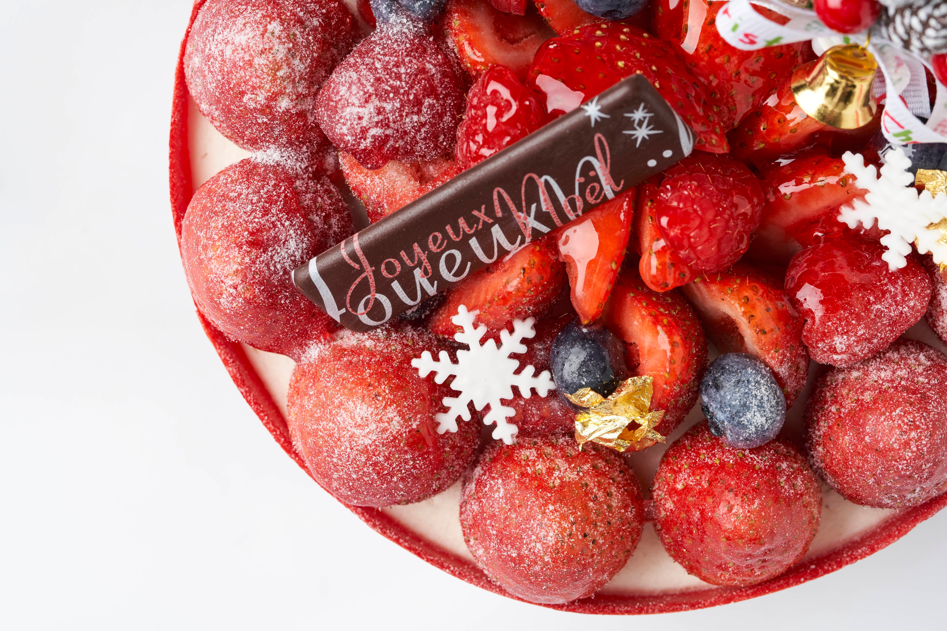 イチゴとの相性が良い北海道産の濃厚、且つミルク感が強く感じられる生クリームを使用。3層のスポンジケーキの間にパティシエが厳選した「とちおとめ」のスライスがサンドされ、ケーキの上にはこぼれんばかりのイチゴとベリーを盛り付けました。ホールケーキの側面をぐるりと覆っているのは深紅のチョコレート。見た目に鮮やかで食べ応えのあるクリスマスケーキに仕上げました。