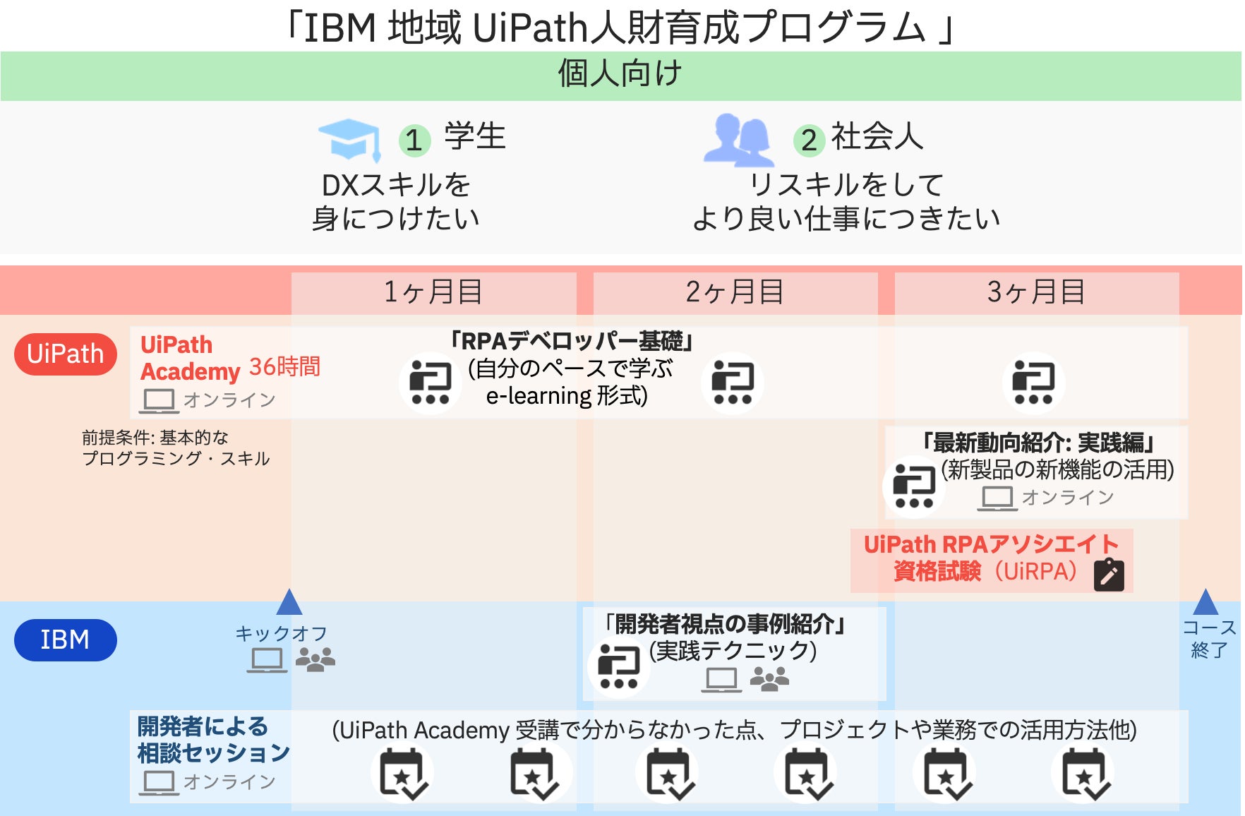 日本IBMとUiPath社は、地域のお客様や協力会社と共にDX人財創出や地域経済の発展を目指すIBM地域DXセンターとの共創により、「地域UiPath人財育成プログラム」を展開し、需要の高いUiPath認定資格を持つRPA技術者を安定的に育成することで、地域で活躍できるDX人財育成と地域DXの推進を支援していきます。