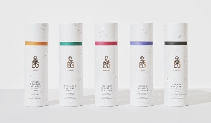 (左から、グリーンルイボスアールグレイ、緑茶アールグレイ、ほうじ茶アールグレイ、ジャスミンアールグレイ、キーマンアールグレイ)