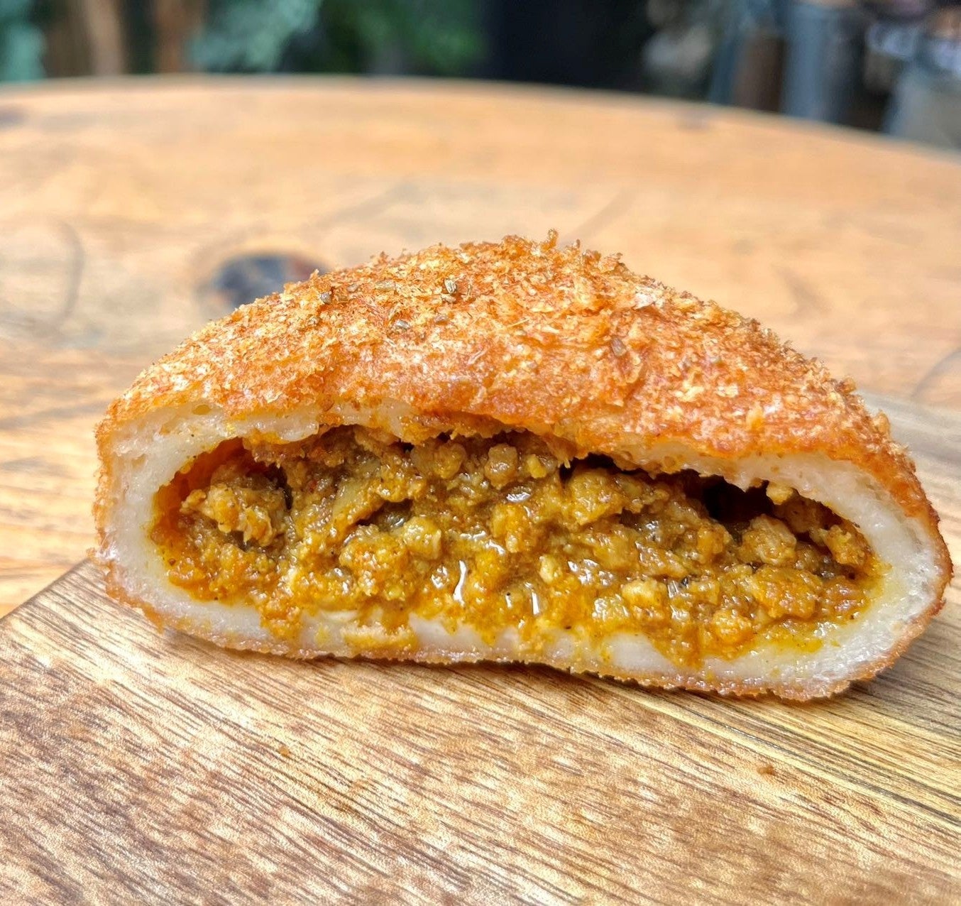 クミン、チリ、ターメリックなど約10種類のスパイスをインド人シェフがカレーパン用に配合。スパイスたっぷりのキーマカレーをもちもちの薄生地で包みました。