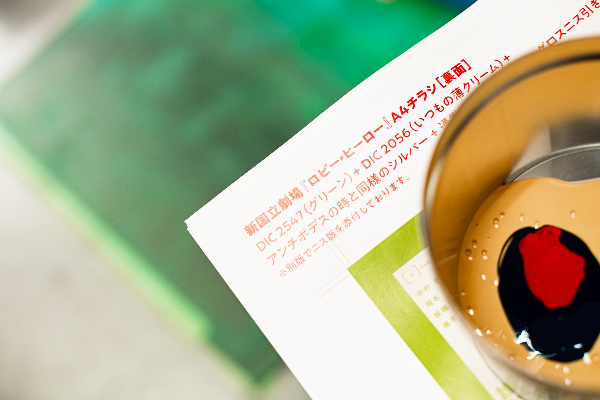 | デザインの現場から一言! 「印刷物で一般的なのはプロセス4色刷(水色、ピンク、黄色、黒)ですが、新国立劇場のチラシの多くはその4色に加えて、メタリックインキや蛍光色などの“特色”も使用しています。プロセス版の上にシルバーのアミを乗せる時などは色校が出てみないと調子が分からない。仕上がりが読みにくいケースはこの段階で微調整することも重要なポイントです」(コードデザインスタジオデザイナー・鶴貝好弘さん) 「初校と再校の間で細やかな差を見抜いて指示を入れてくださる鶴貝さん。指示書を一見した段階ではその差が明確には分からないのですが、いざ最終校が上がってきた時には全体の完成度がぐっと高いものになっていて、毎回驚いています。細部に魂は宿る。そんな印象を受けるプロセスです」(新国立劇場宣伝担当) |