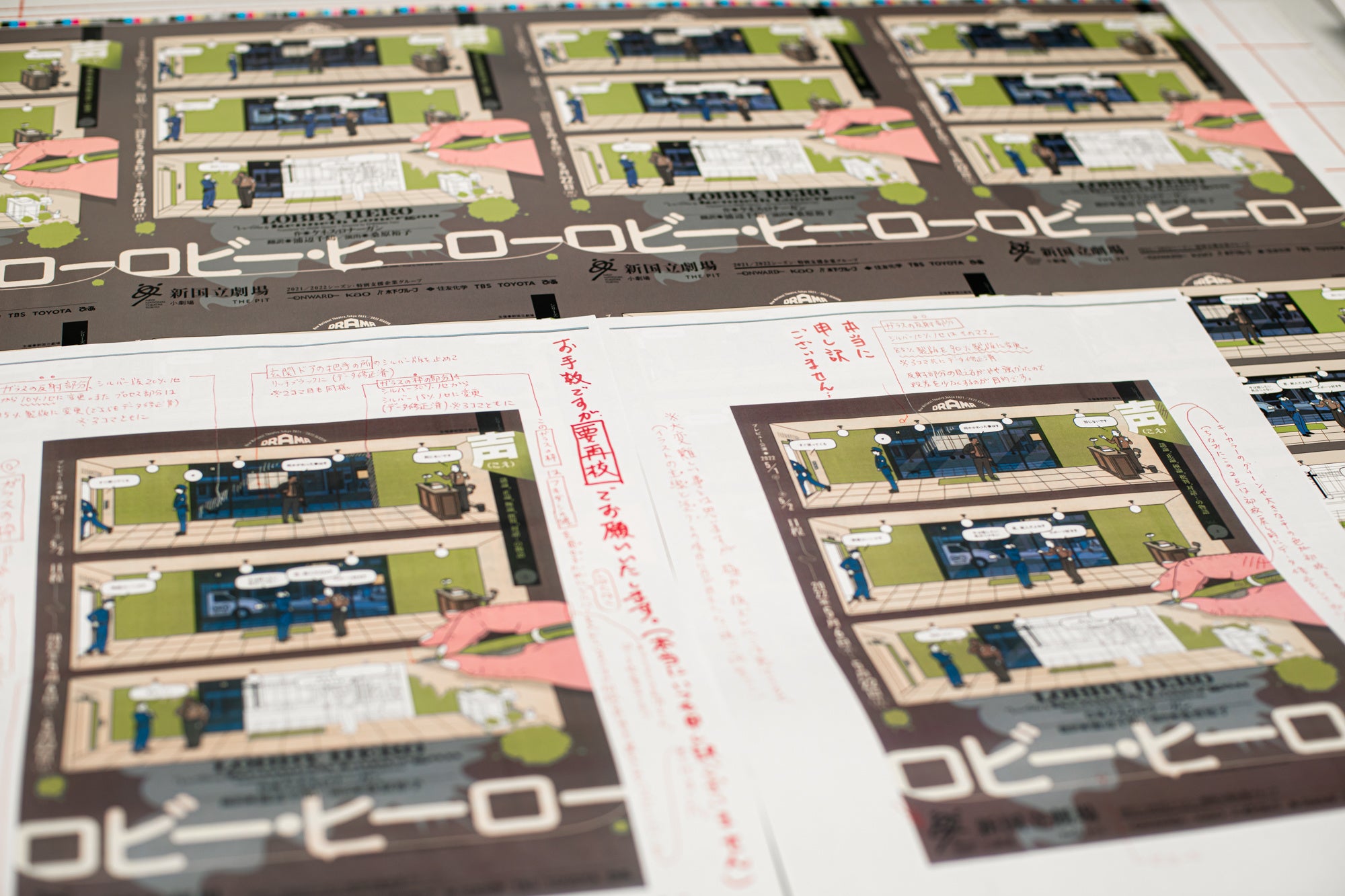 たくさんのアイデアと想いをのせた『ロビー・ヒーロー』のチラシが、こうして今、形になった。4つの道程とそれぞれのフロアを担当する多くの方々の手仕事を経てようやく、ゆくゆく私たちが受け取るその一枚は完成するのである。