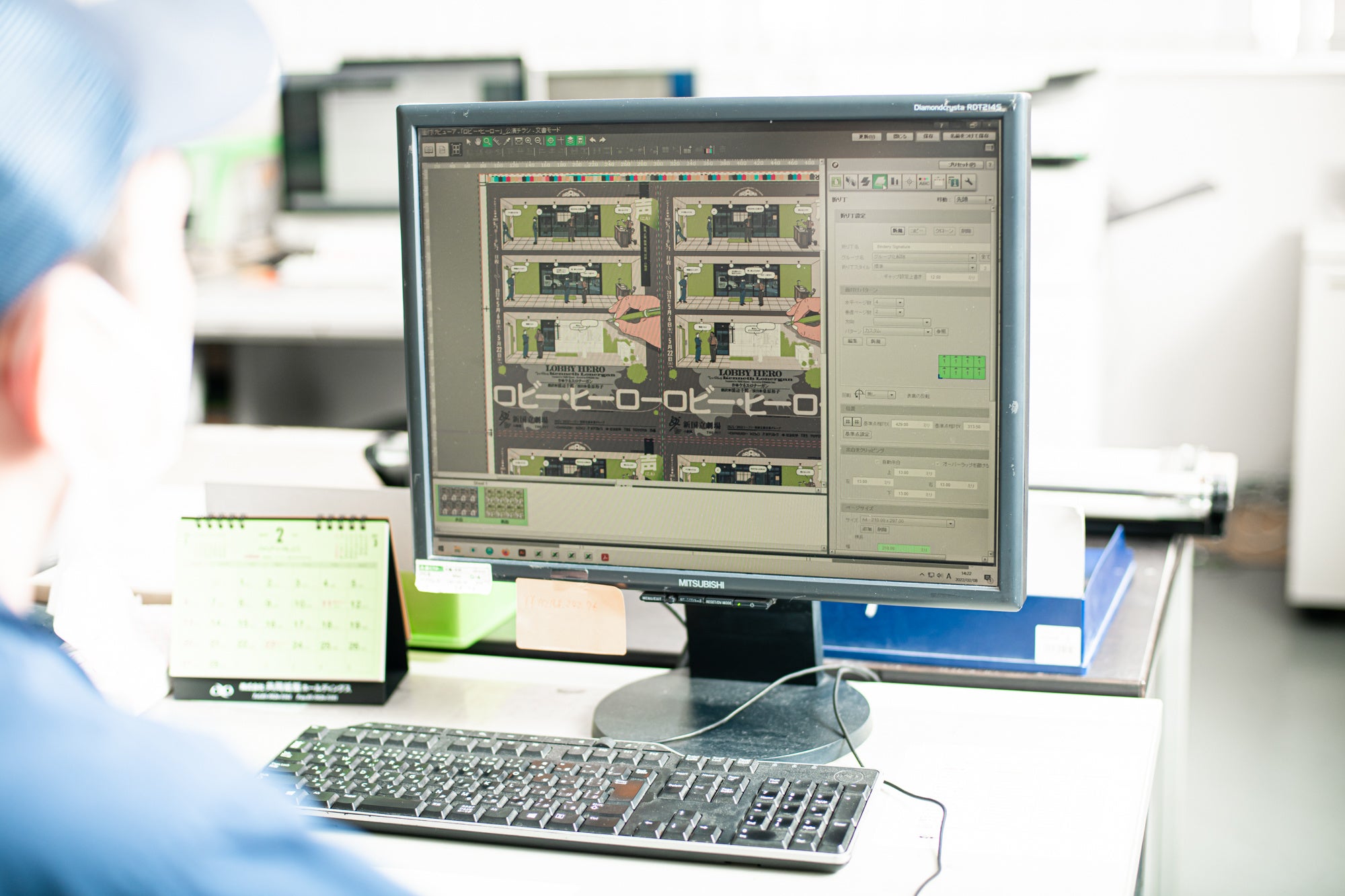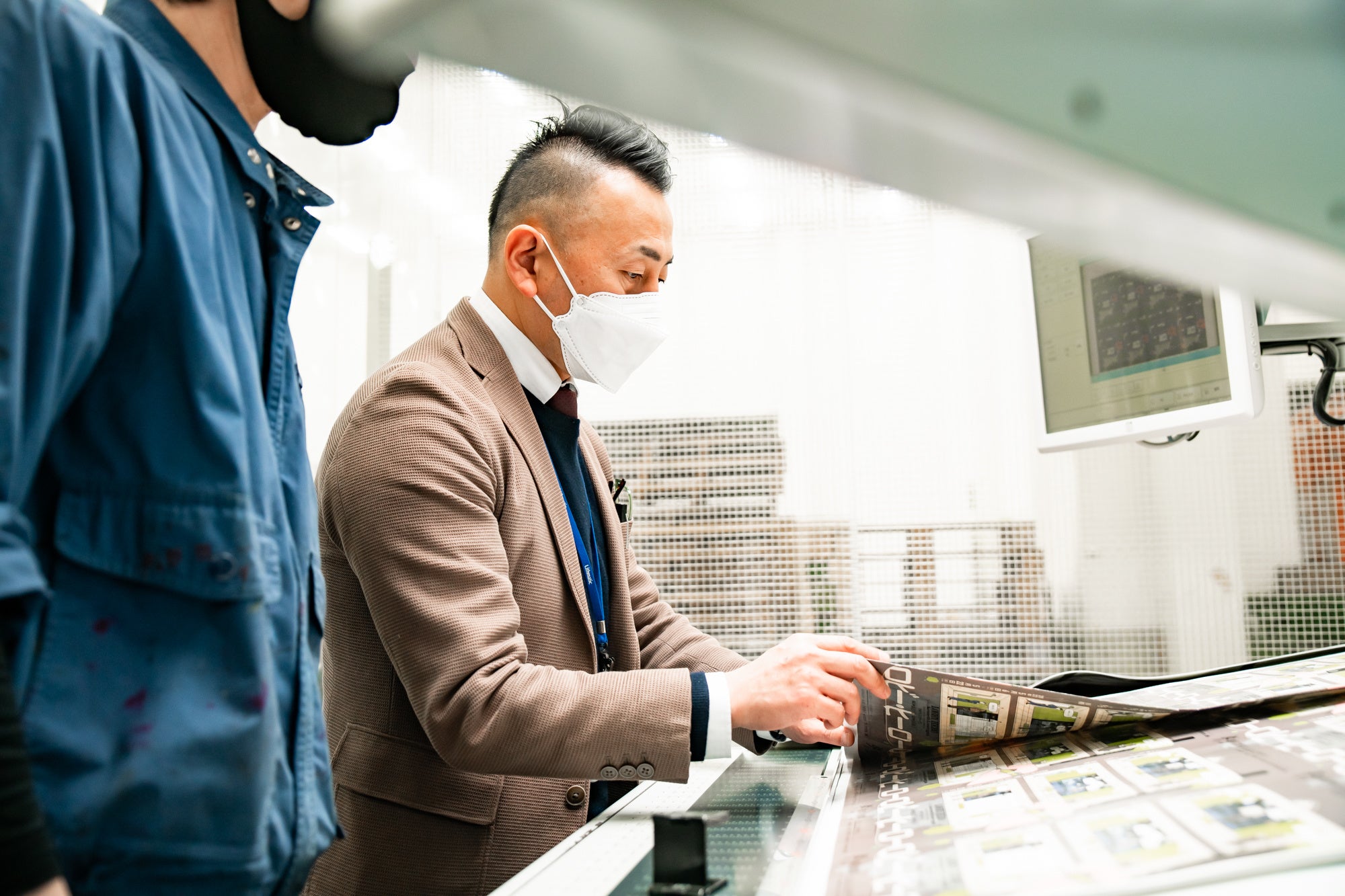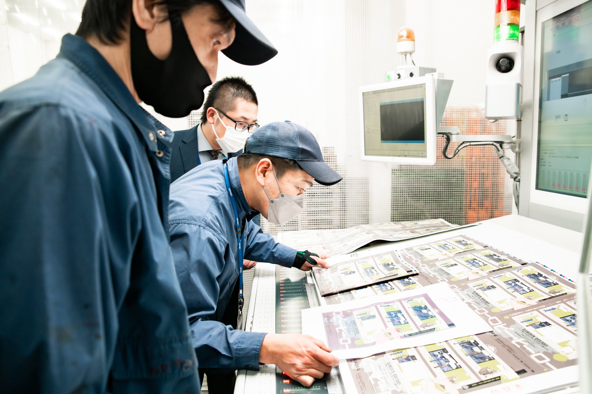 作業服を着た人もいれば、スーツの人も。印刷作業を行う人だけでなく、デザイナーとの直接やりとりを重ねる営業担当者も営業所から駆けつけ、作業が完了するまで立ち合うのだ。
