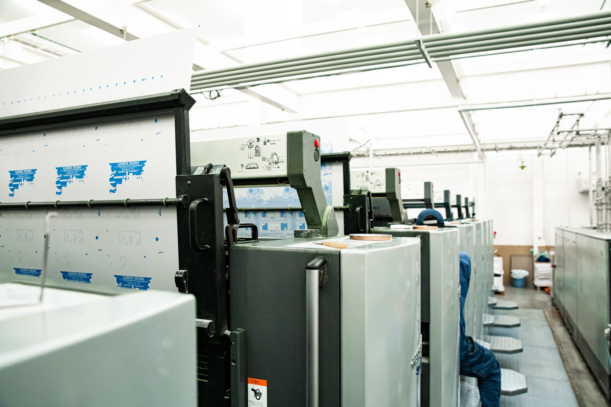 いよいよ印刷フロアへ。巨大な機械が連なるこのフロアは、まさに工場!という感じだ。それぞれの版とインクをセッティングし、一斉に印刷を開始。ここで一番驚いたのは、現場にいる人の多さだった。
