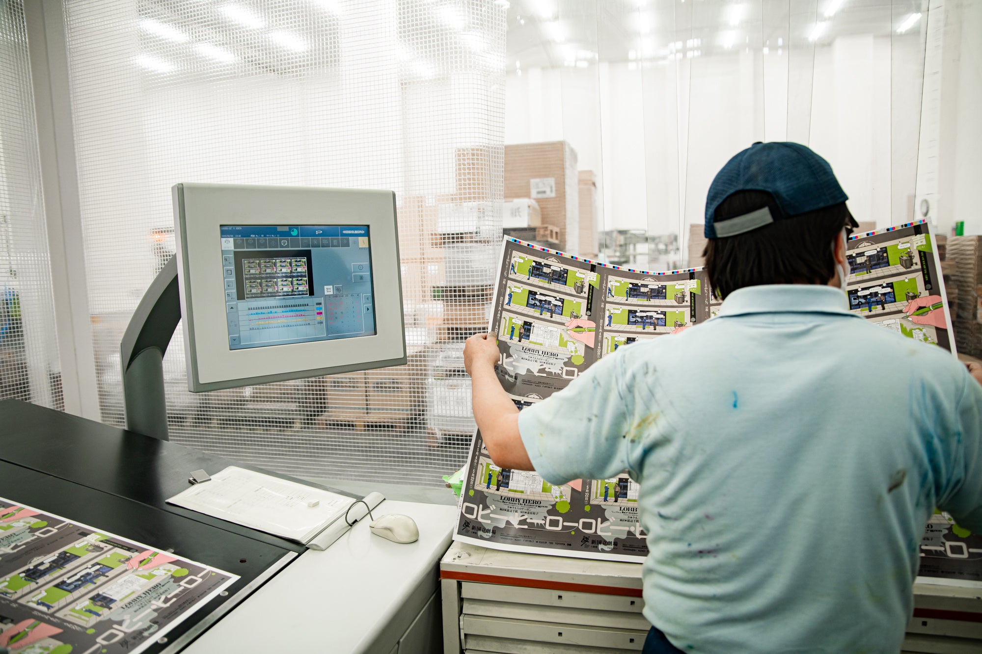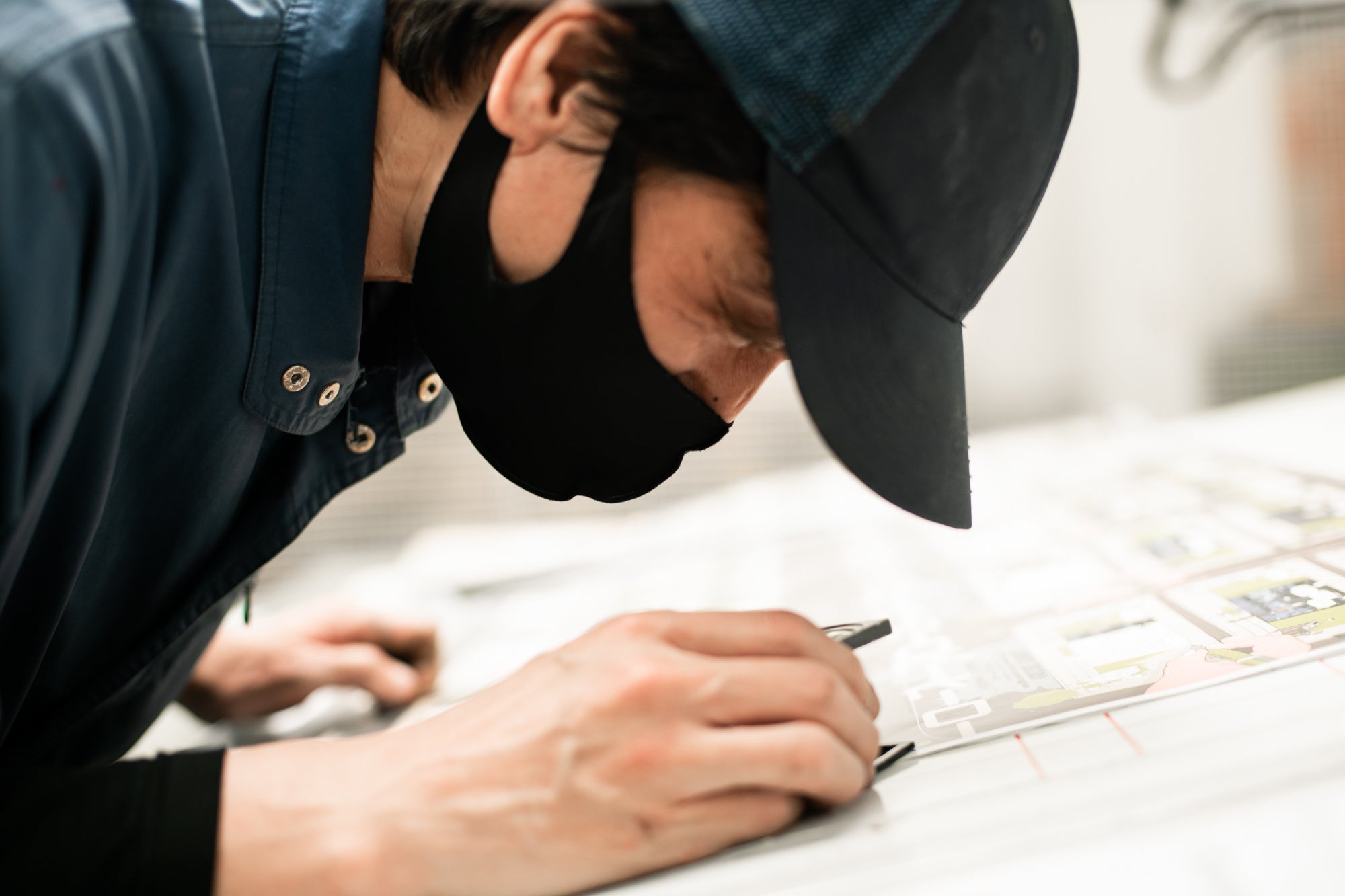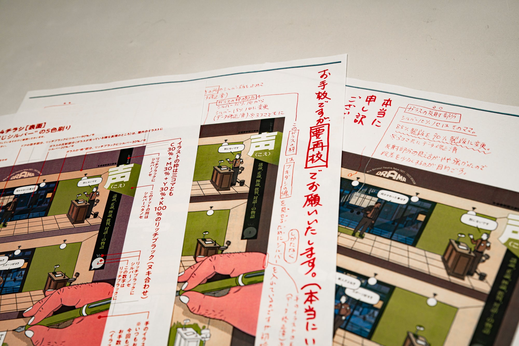①を経て仕上がったデザインを印刷会社へ発注。ここからさらに色味や版の出方などを吟味しながら、デザイナーと印刷会社による細やかな最終調整へ。デザイナーは数回に渡り色校正を確認し、印刷会社はその指示書を元に最終色校へと進める。