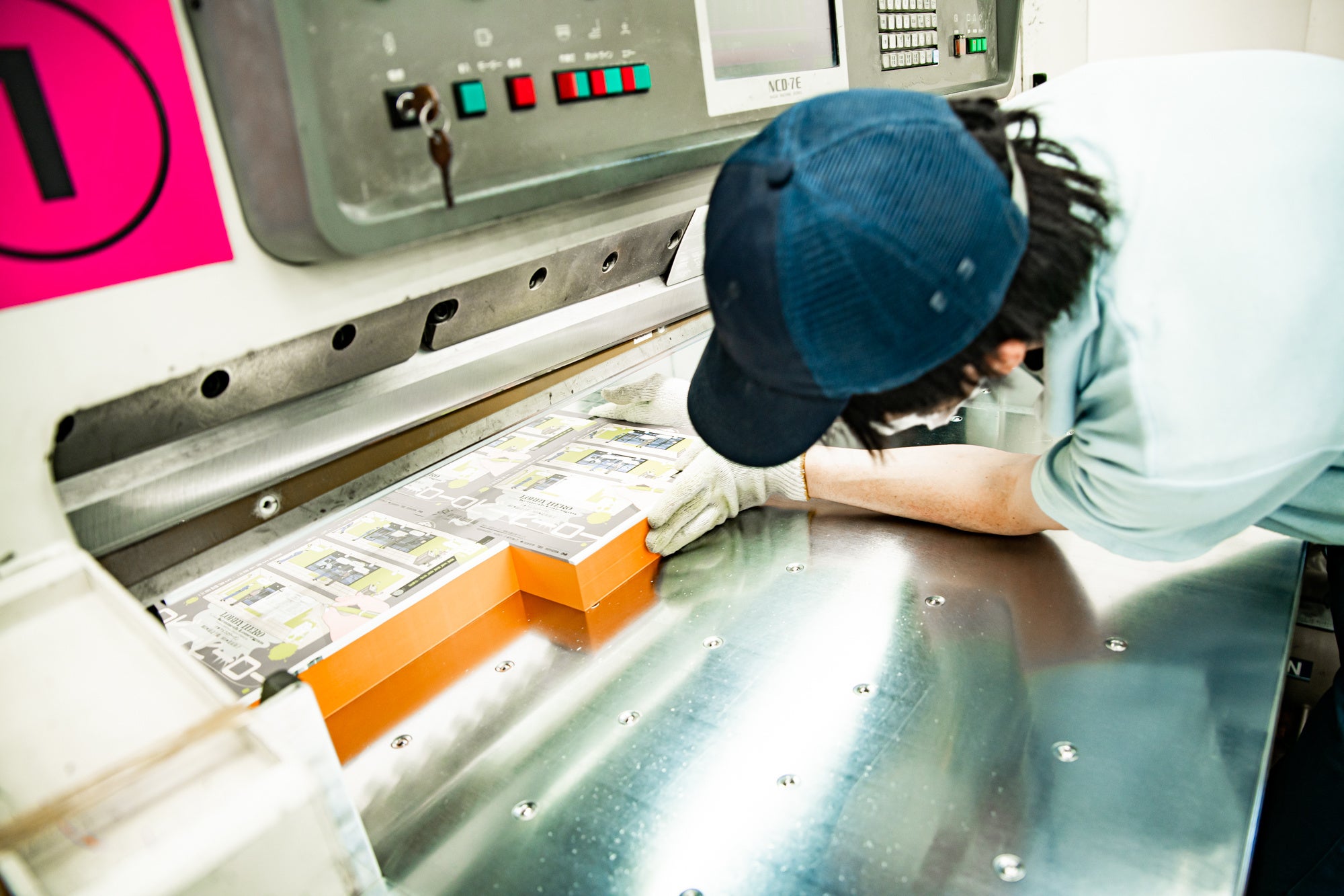 作業もついに最終ゾーンへ。印刷されたものをサイズに応じて断裁する。膨大な紙を一度に機械で断裁するため、空気が入ってズレが生じないように丁寧にプレスをかけ、紙が極端に少なくなった際には不要な紙でかさ増しをした状態で機械にかける。