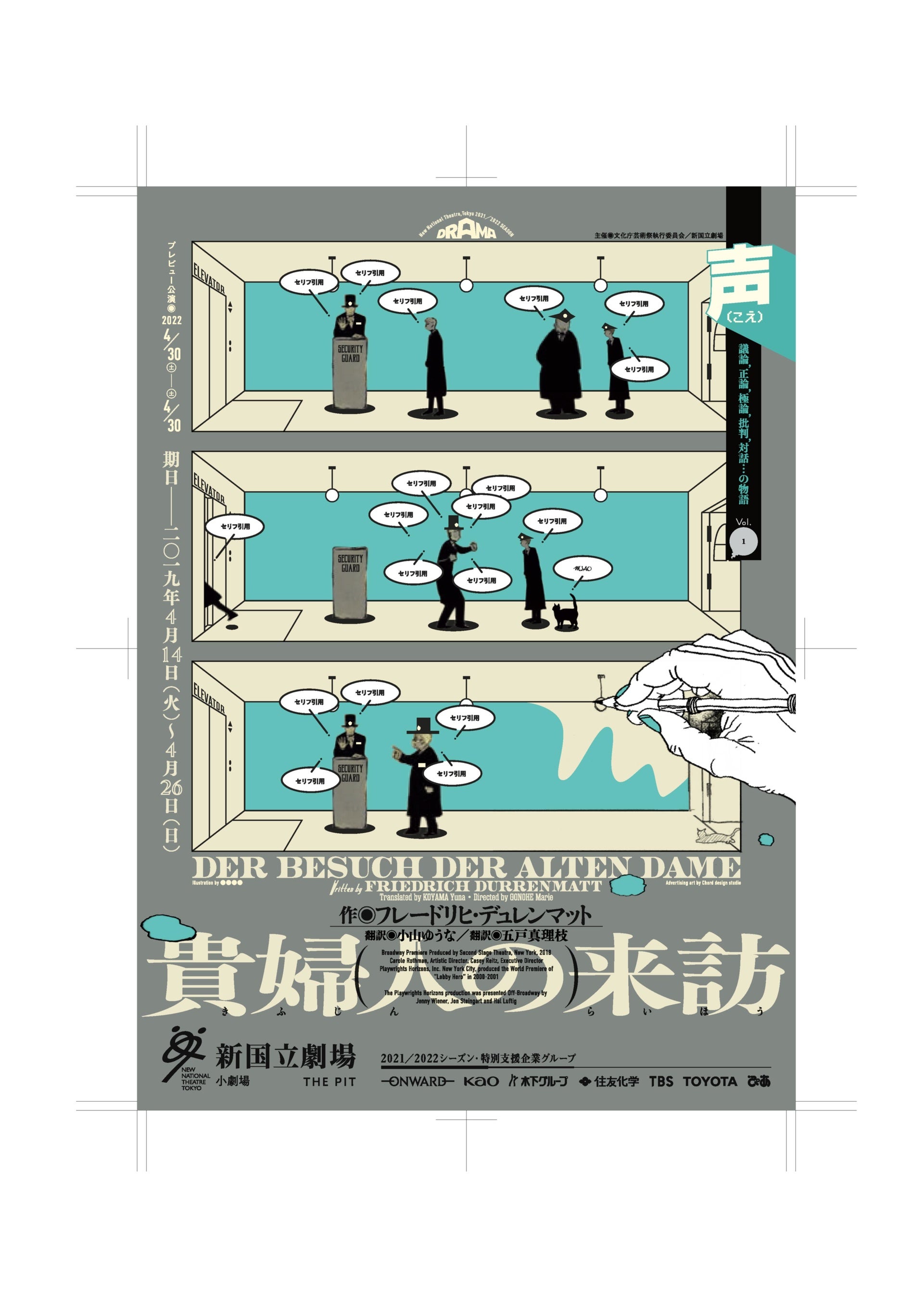 | デザインの現場から一言! 「デザイナーの最初の作業は台本を読むこと。その後の進行は“シリーズもの”と“単作もの”とで変わりはありませんが、シリーズもののチラシは芸術監督の小川さんから「フォーマットにしたい」という意向が伝えられています。そのため、単作の佇まいということではなく、シリーズ全作の世界観が同フォーマットに違和感なく収まるのかをシミュレーションする意味合いでもオリエン前に全作の台本を読んでラフを制作しています」(コードデザインスタジオ デザイナー・鶴貝好弘さん) 「初回から具体的なラフがあることで話し合いのスピードも濃度もグッと高まり、着地点も見えやすくなります。言葉だけだと理解できない部分がイメージ案によって補填され、全員がある程度の共通意識を持つことができています」(新国立劇場宣伝担当) |