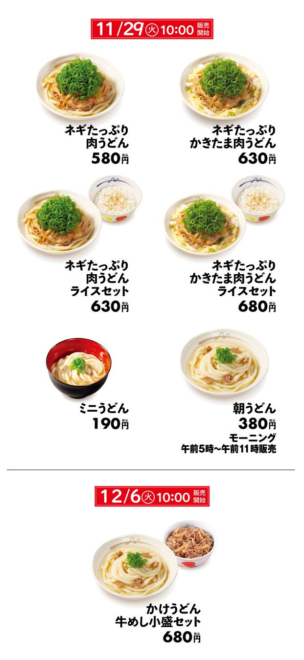 | 商品名 【11月29日(火)販売開始】 ネギたっぷり肉うどん 580円 ネギたっぷりかきたま肉うどん 630円 ネギたっぷり肉うどんライスセット 630円 ネギたっぷりかきたま肉うどんライスセット 680円 ミニうどん 190円 朝うどん(午前5時~午前11時販売) 380円 【12月6日(火)販売開始】 かけうどん牛めし小盛セット 680円 ※お持ち帰りいただけません。 ※みそ汁は付きません。 ※全て税込み価格です。 発売日 2022年11月29日(火)午前10時 ~ 対象店舗 一部店舗で限定販売 下記URLよりご参照ください。 11月29日販売開始:https://bit.ly/2BWk95J 12月6日販売開始:https://bit.ly/2F0imeA |