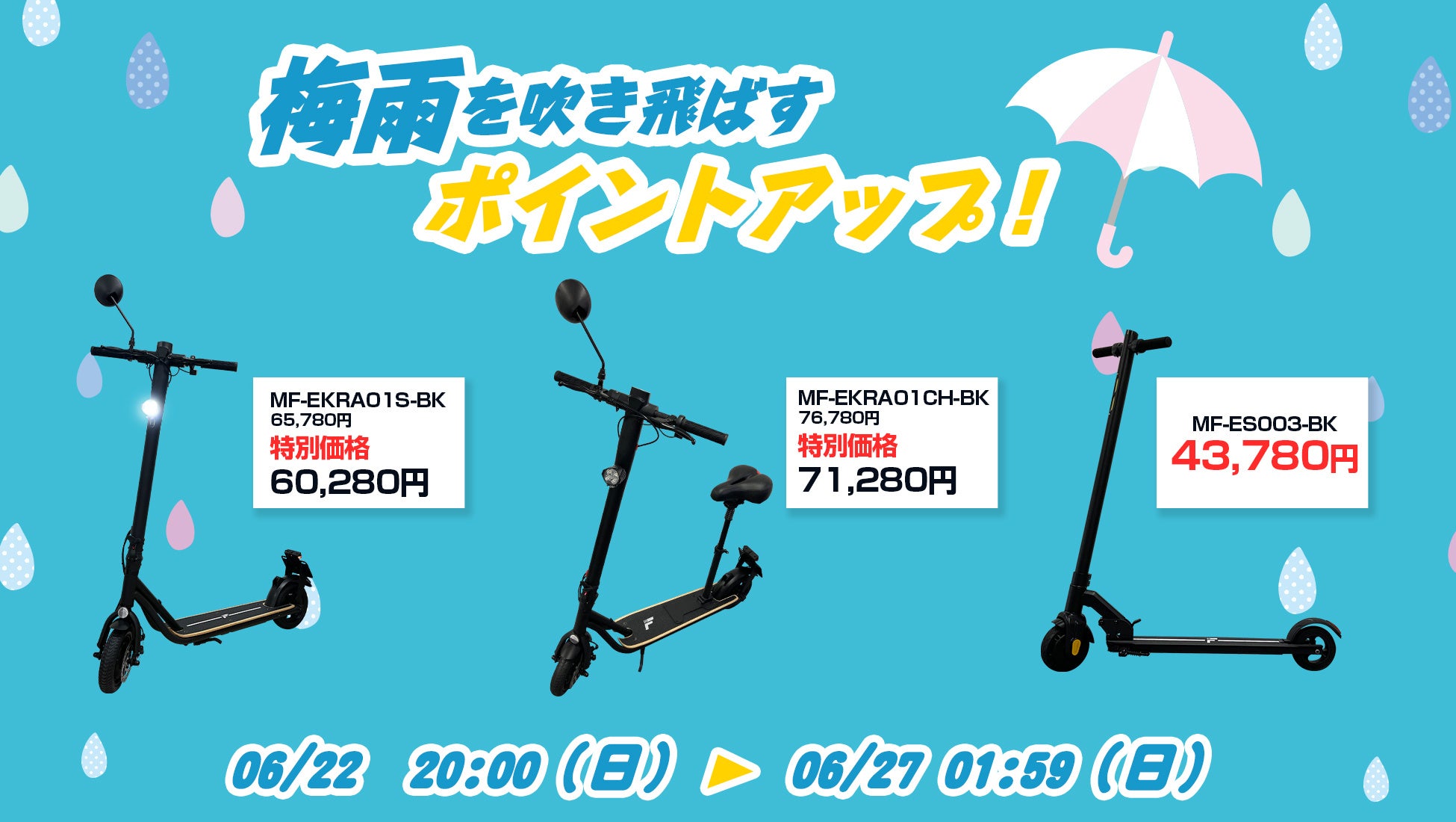 楽天「Show !t」レジャーにおすすめ、公道走行対応電動キックボードの5,000円オフセールを開催。さらに6月22日(木)20時スタート全商品ポイント10倍、楽天お買い物マラソンに参加。