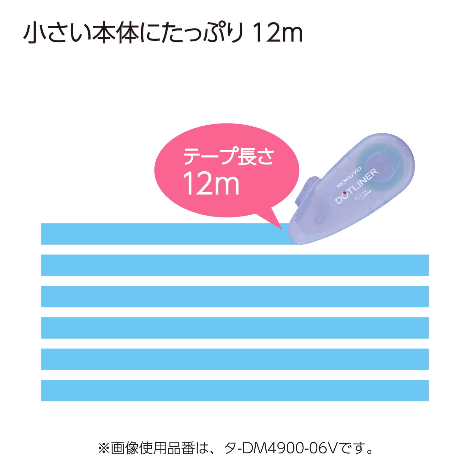 内部設計を最適化することによって、つめ替えタイプのテープのりとして、業界最小クラスの本体サイズを実現しました。また、コンパクトな本体サイズながら、テープ長さは12m。ペンケースによりスリムに収納できるよう、本体の薄さにもこだわっています。(厚さ17mm/自社製品「ドットライナーフィッツ」との比較:厚さ−2mm)